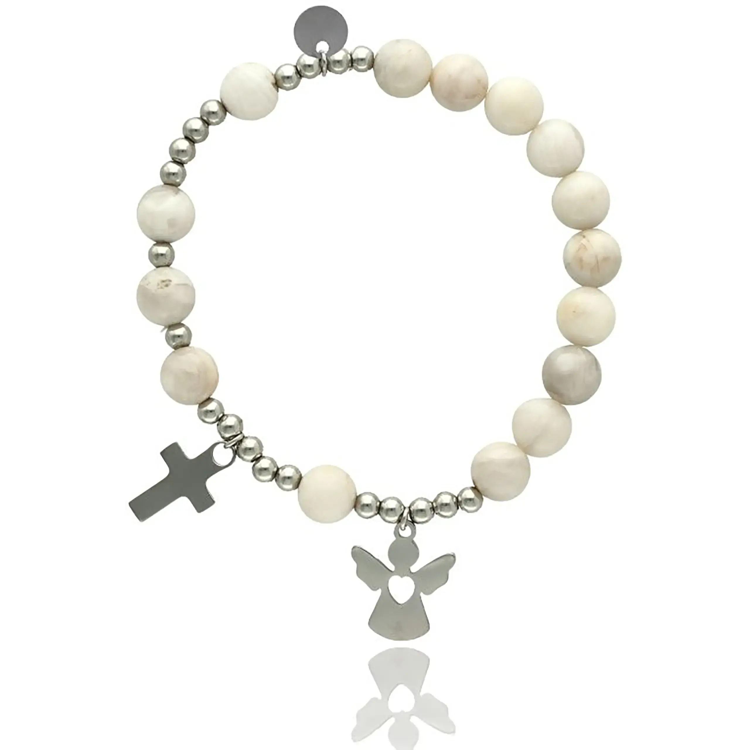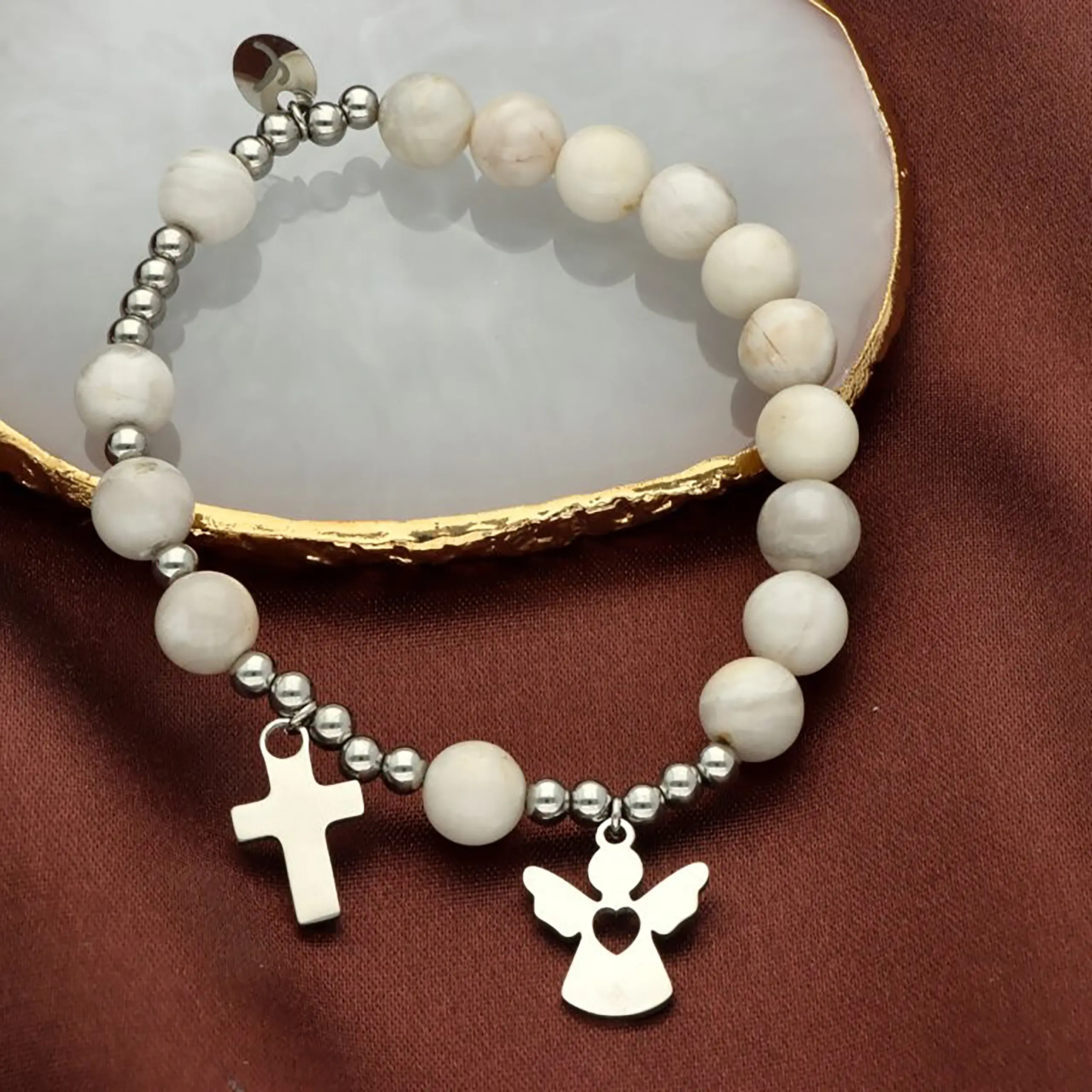 - Bransoletka religijna – zawieszka krzyżyk oraz aniołek podkreślają chrześcijański charakter