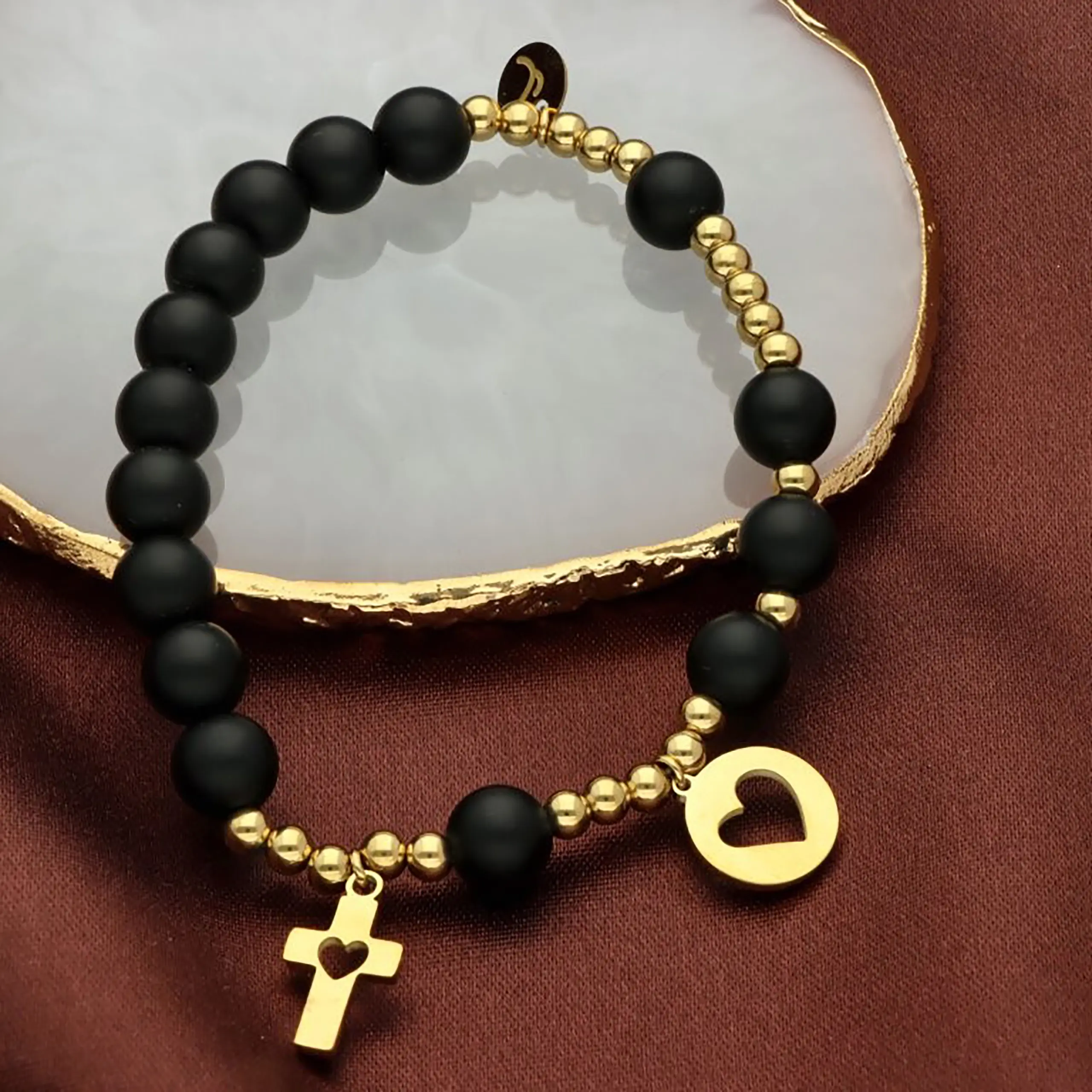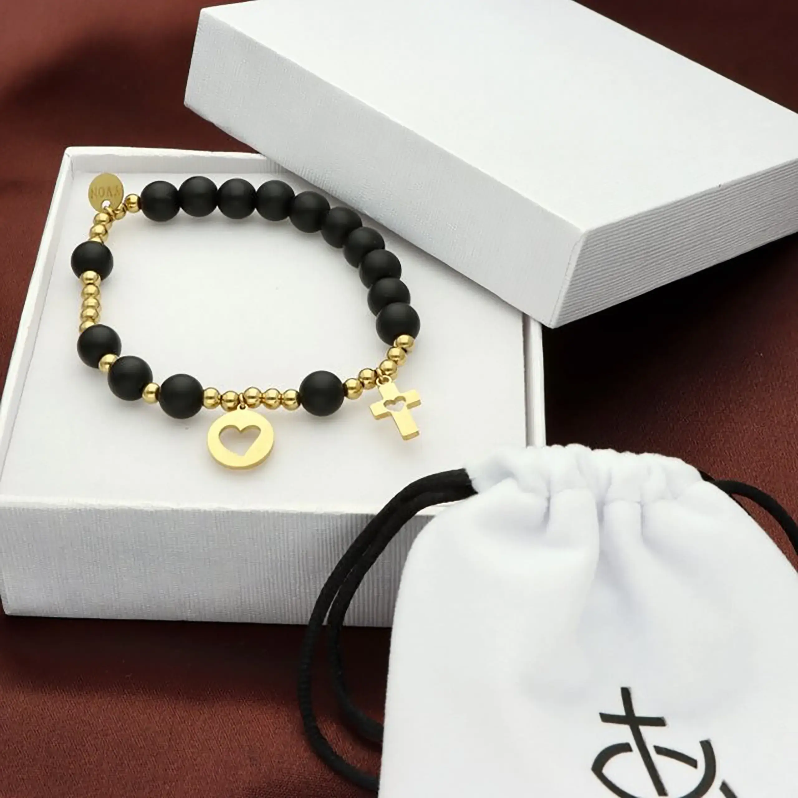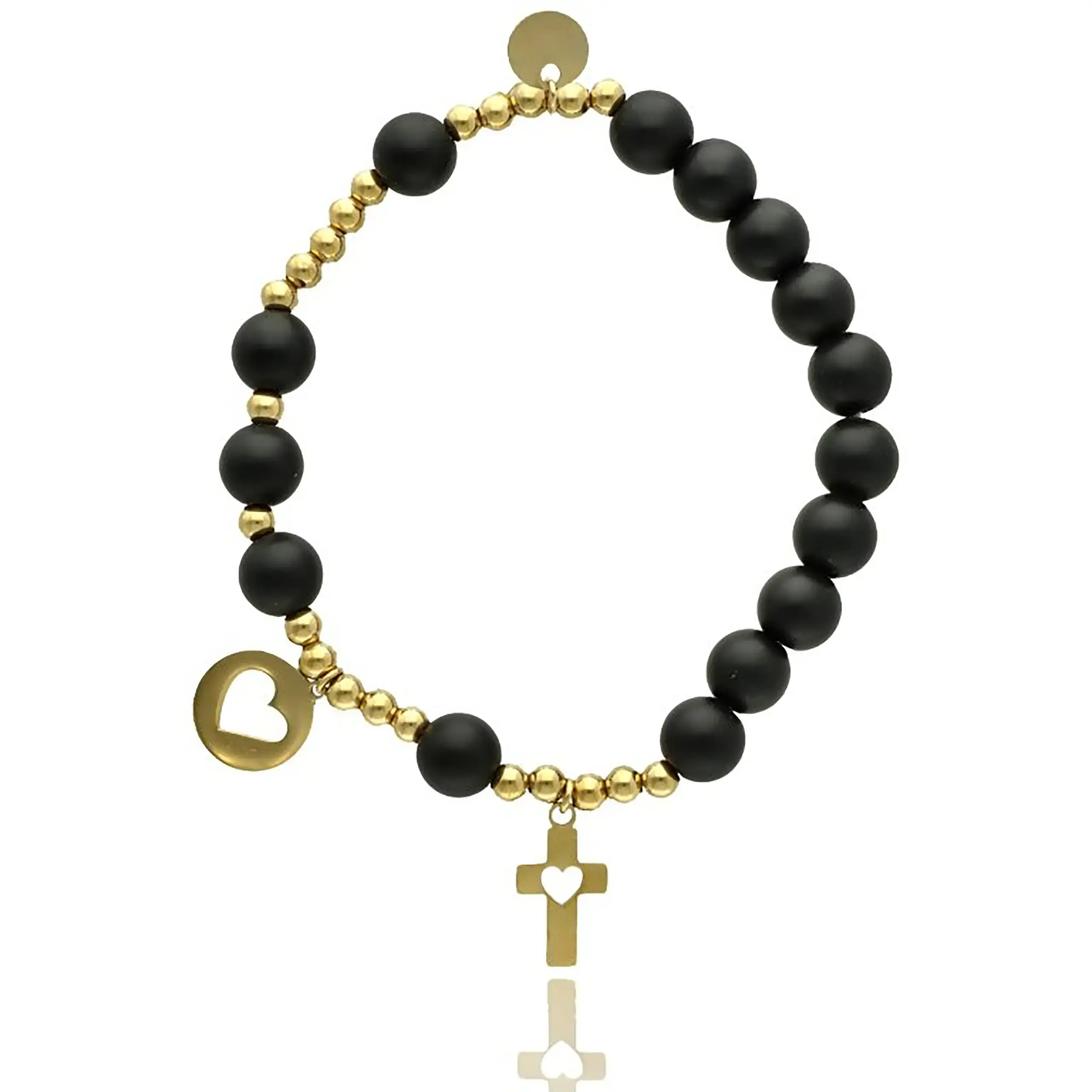 Bransoletka różaniec z agatu czarnego ZŁOTY KRZYŻYK SERCE