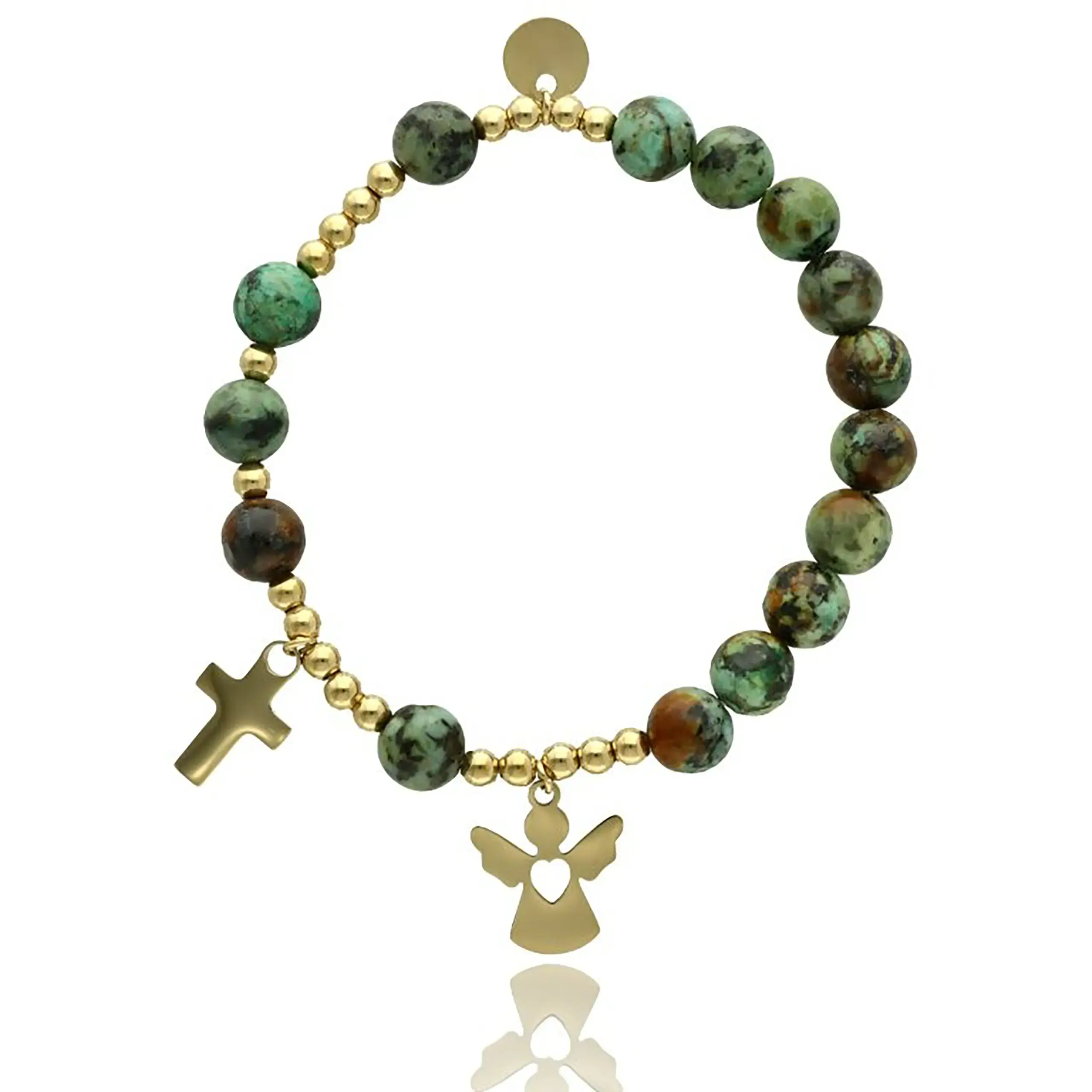Bransoletka różaniec damska wykonana z naturalnego kamienia to wyjątkowe połączenie eleganckiej biżuterii i religijnej symboliki. Kamień turkus afrykański zachwyca niepowtarzalnym wzorem oraz harmonijną kolorystyką zieleni, brązu i szarości. Złote detale, krzyżyk oraz zawieszka aniołka ze stali szlachetnej nadają całości subtelny i ponadczasowy charakter. To doskonały wybór dla kobiet, które chcą nosić wiarę blisko siebie każdego dnia.