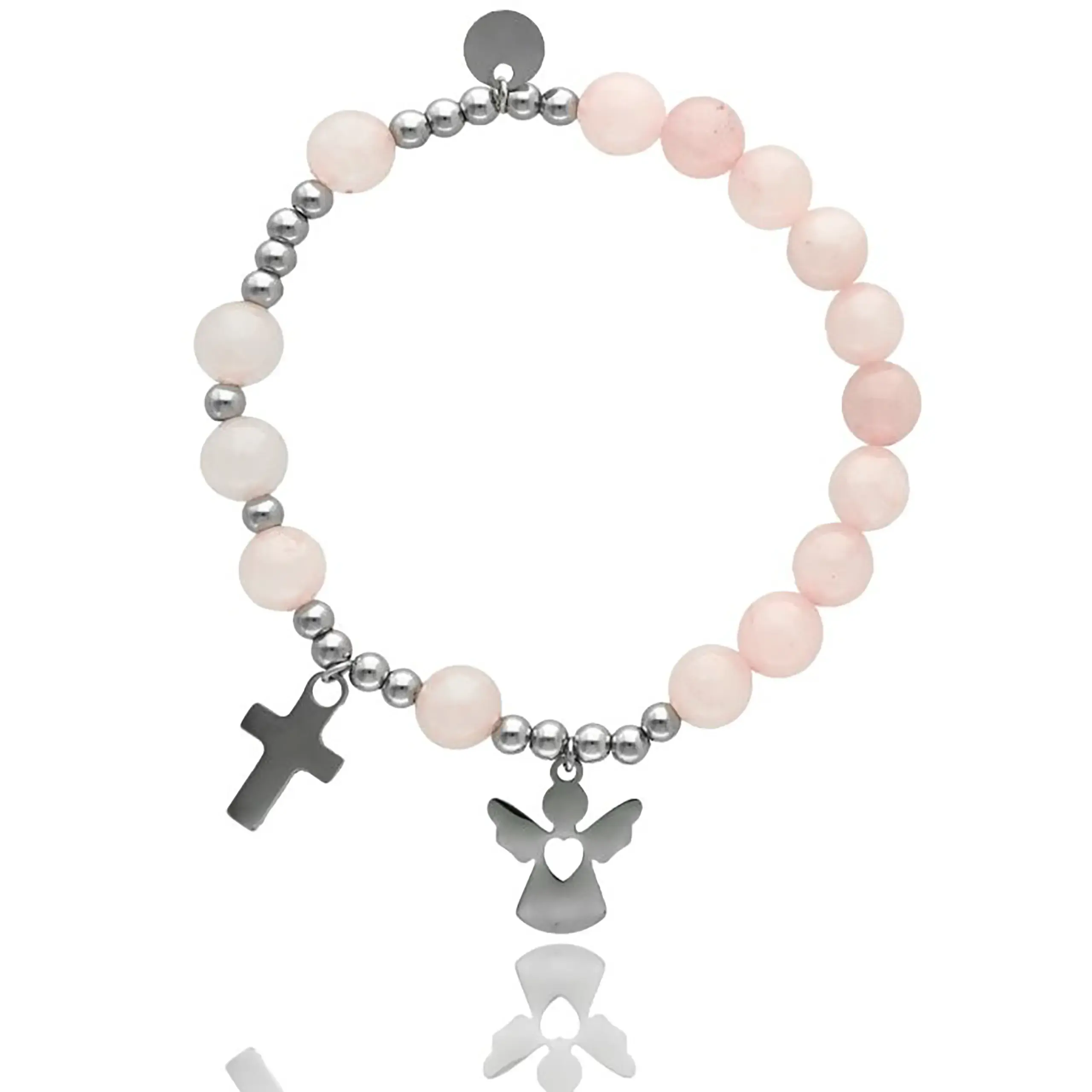 Bransoletka różaniec z jadeitu różowego ANIOŁEK I KRZYŻYK