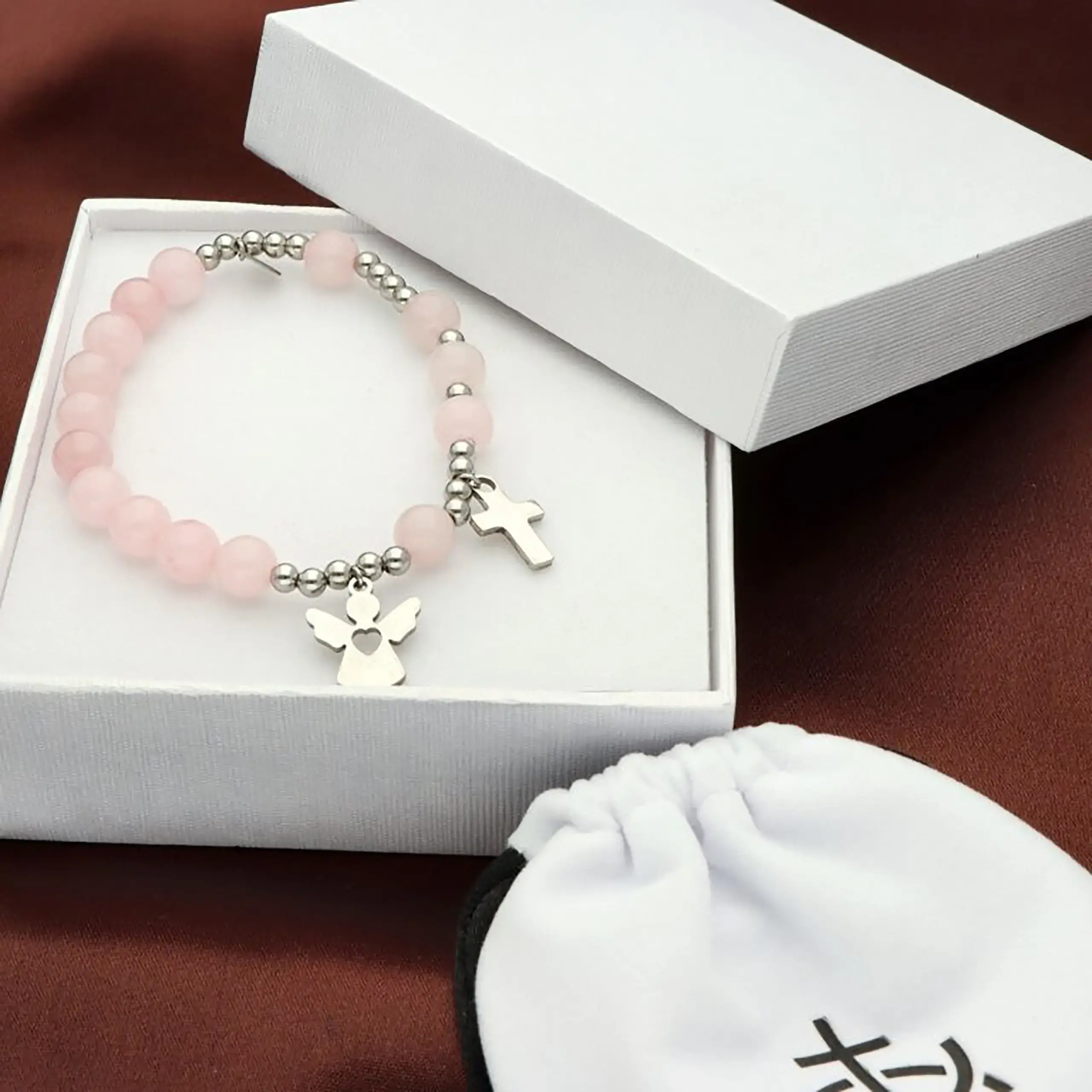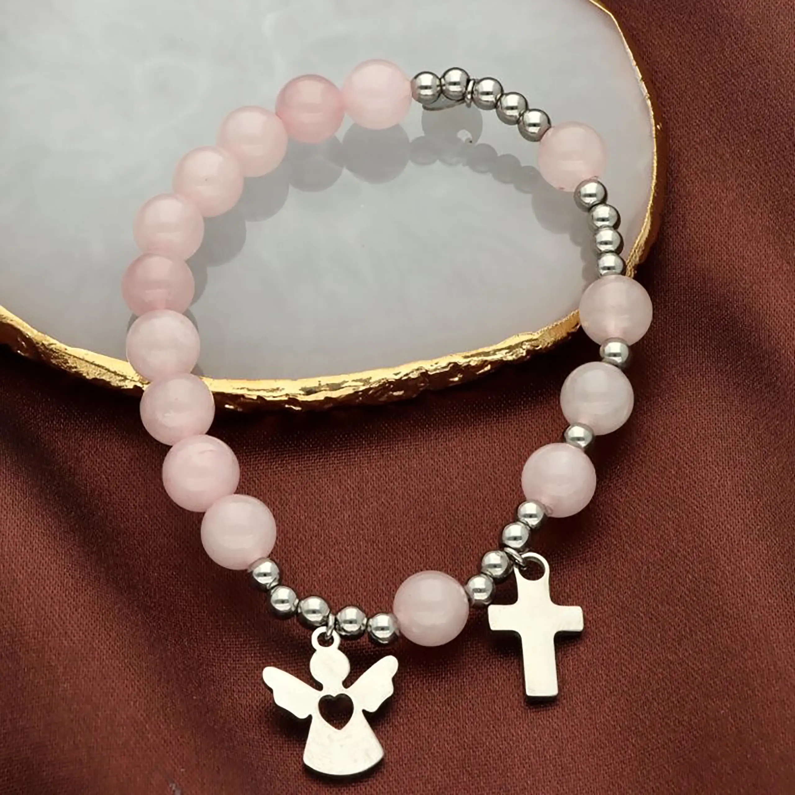 Ta bransoletka z kamieni naturalnych będzie doskonałym wyborem na Pierwszą Komunię Świętą, bierzmowanie, urodziny, imieniny czy jako codzienna pamiątka religijna. Delikatny różowy kolor szczególnie dobrze sprawdzi się jako prezent dla dziewczynki, nastolatki lub kobiety.