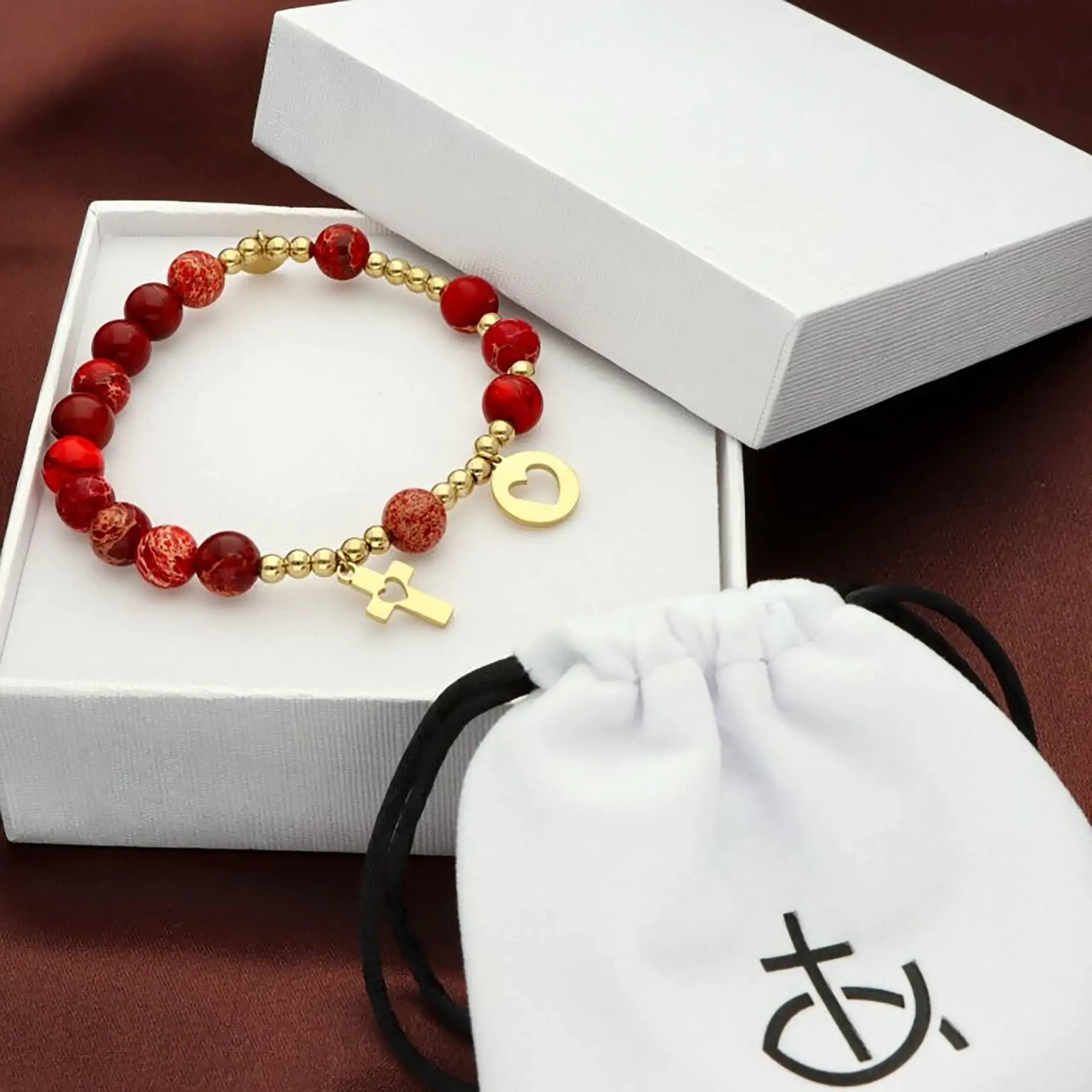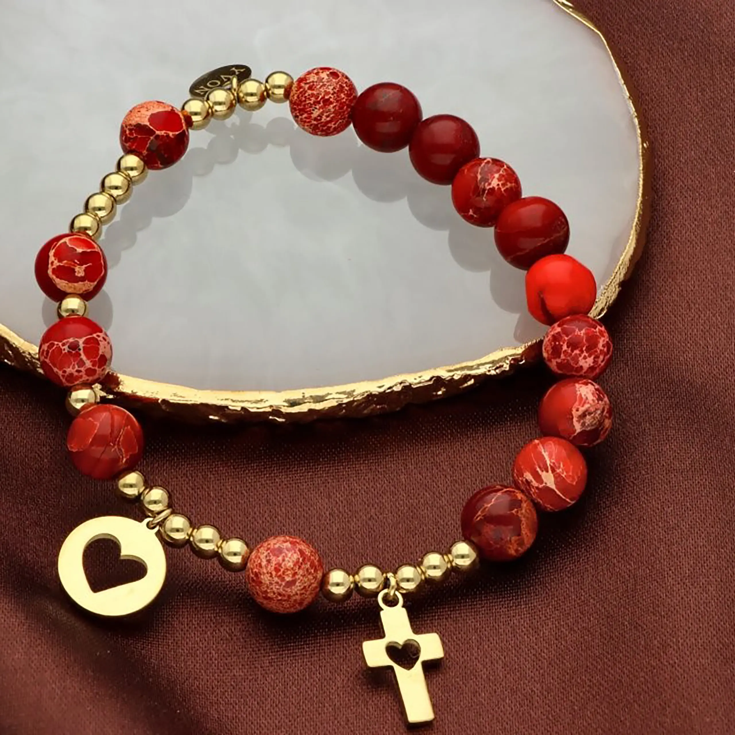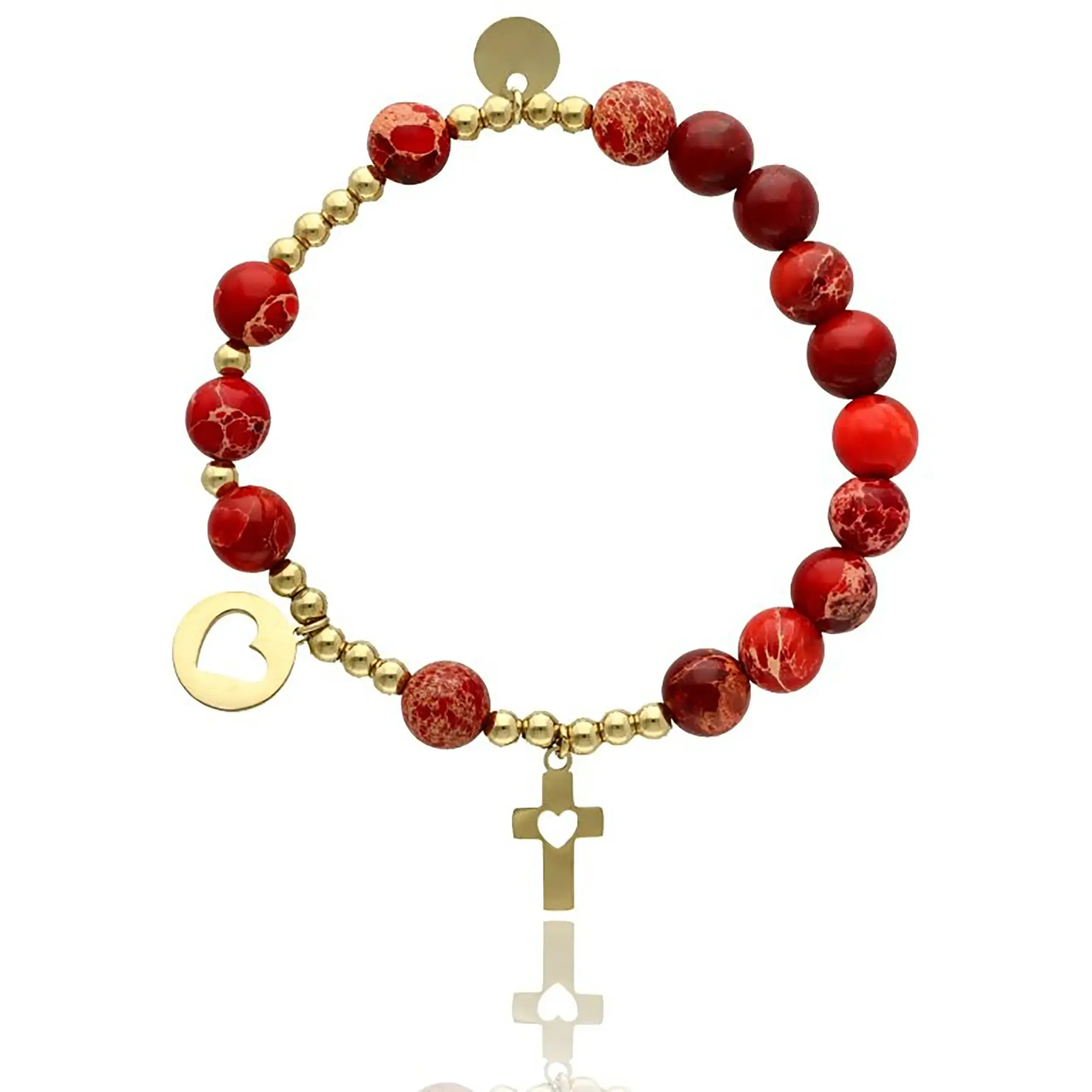 Ta bransoletka z kamieni naturalnych została stworzona z myślą o kobietach, które chcą połączyć elegancki wygląd z wartościami chrześcijańskimi. Czerwony jaspis cesarski przyciąga uwagę głębią barw i szlachetnym wzorem, a złoty krzyżyk z sercem nadaje całości wyjątkowego charakteru.