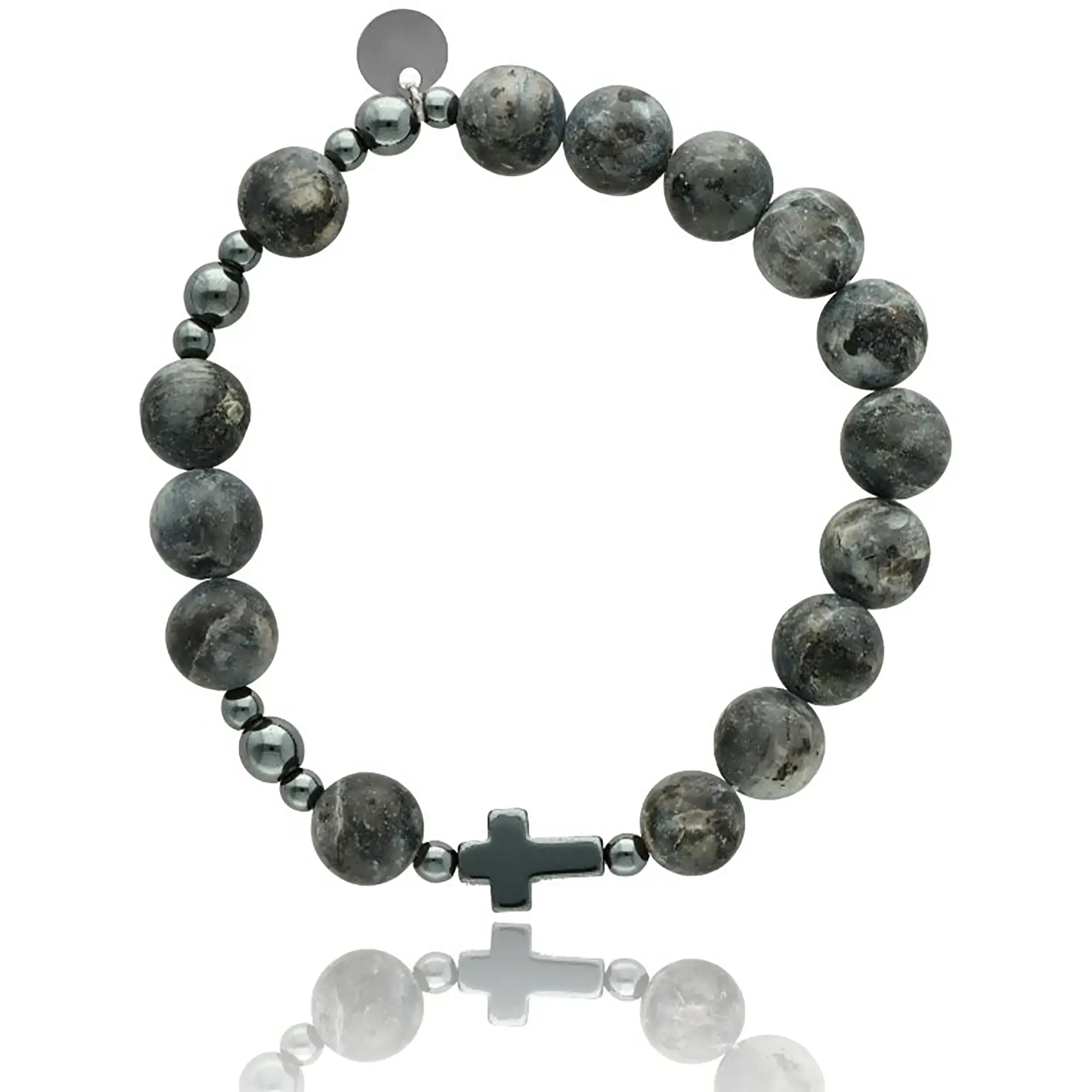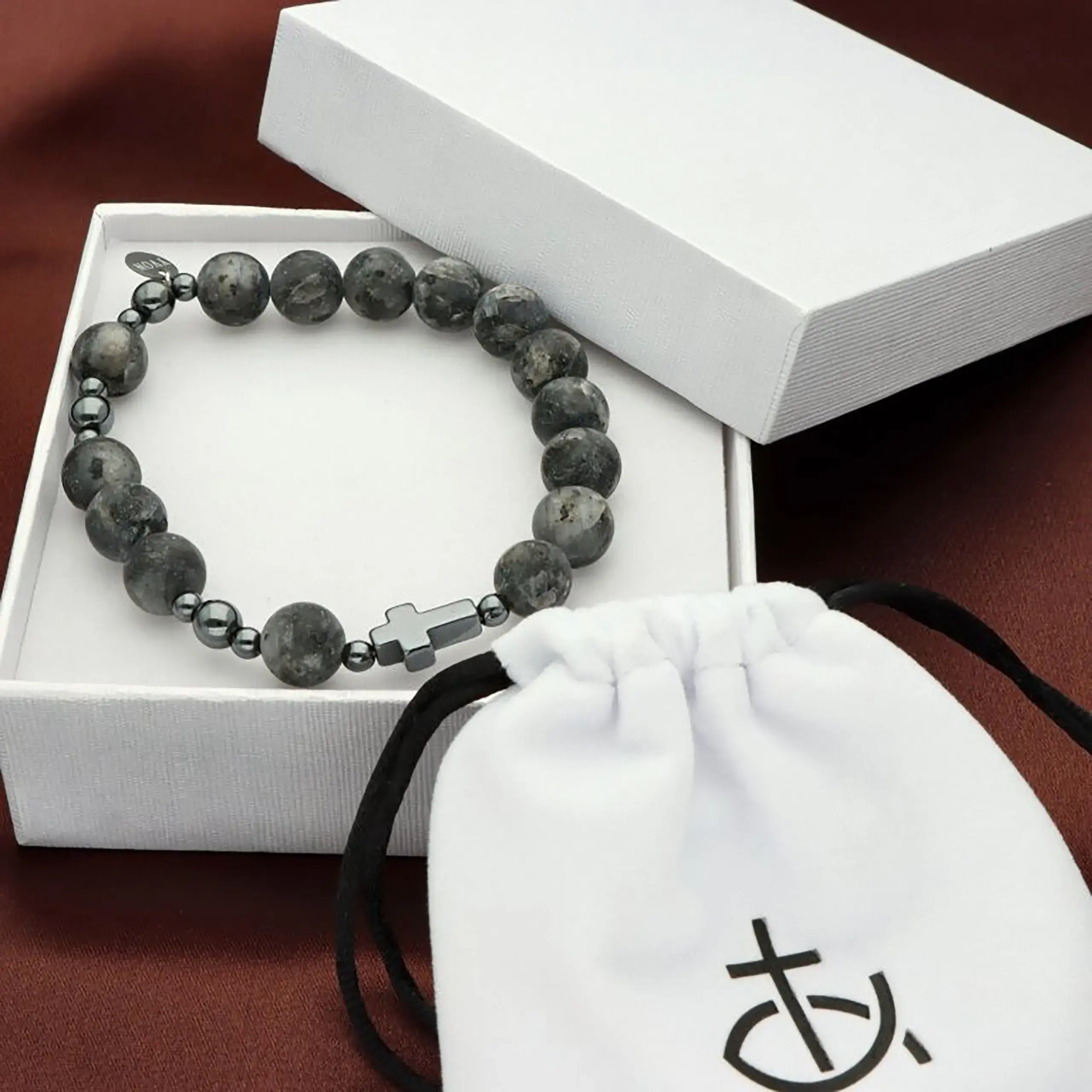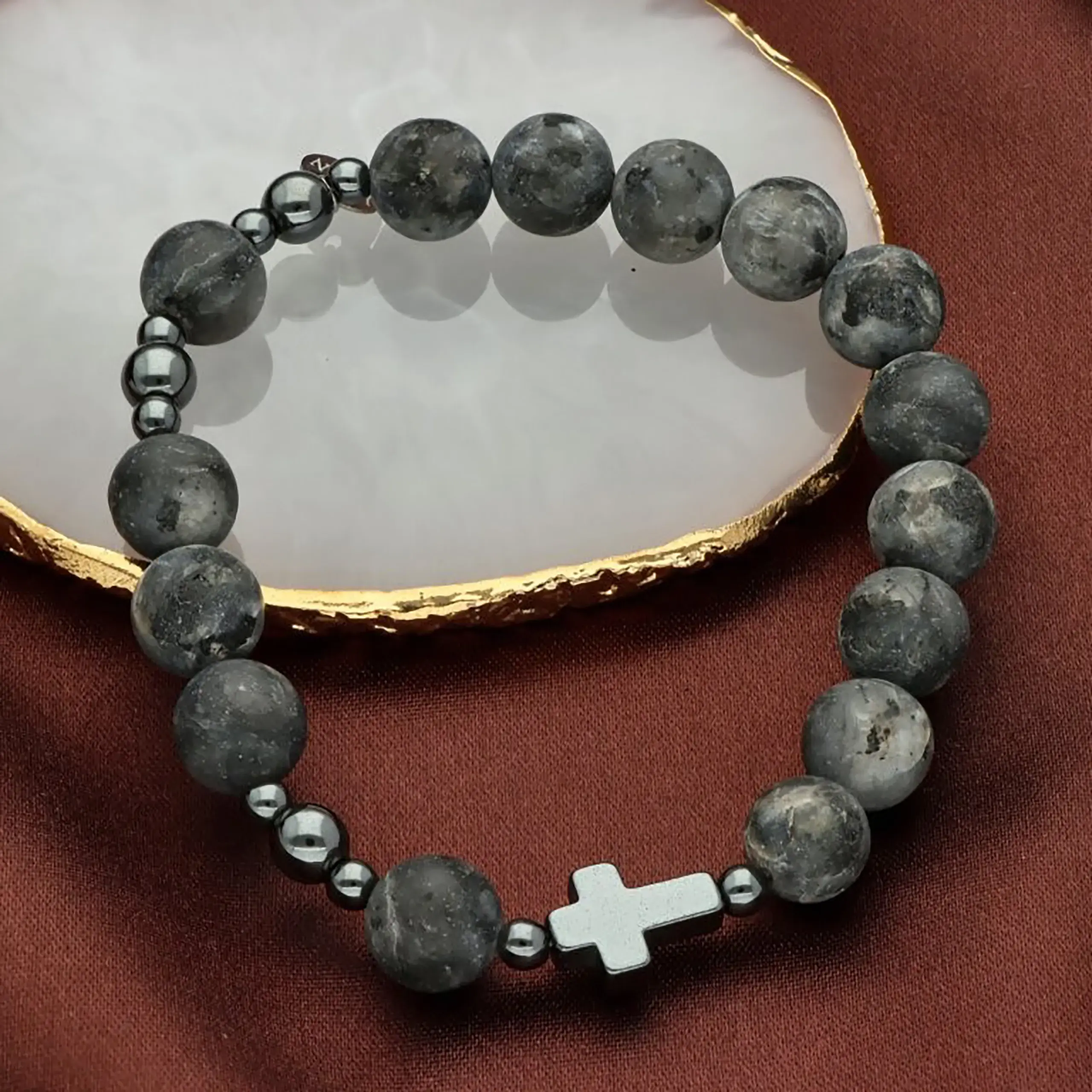 Stylowa i ponadczasowa bransoletka różaniec męski to wyjątkowe połączenie religijnej symboliki oraz nowoczesnego wzornictwa. Wykonana z naturalnego labradorytu zachwyca szlachetną kolorystyką w odcieniach grafitu, szarości i czerni. Subtelny krzyżyk z hematytu podkreśla duchowy charakter produktu, a elegancka forma sprawia, że bransoletka doskonale pasuje do codziennego stroju, marynarki lub koszuli.