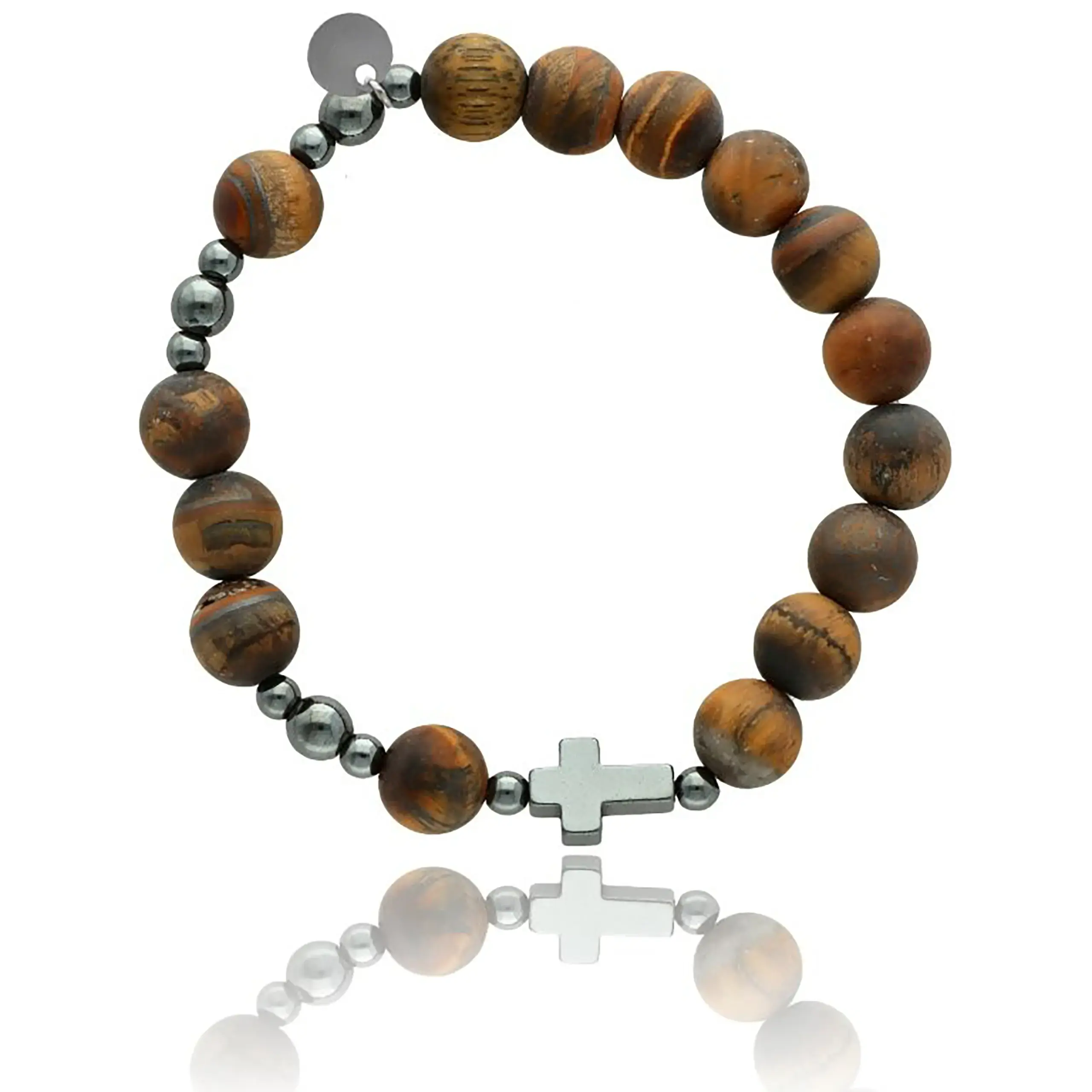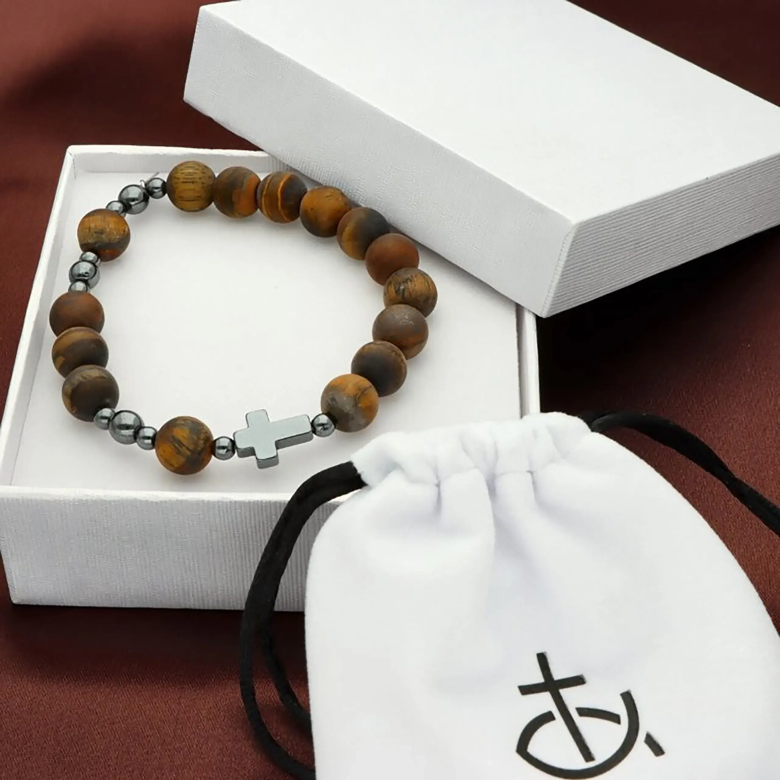 Bransoletka różaniec męski z naturalnego kamienia to stylowy dodatek o głębokiej symbolice religijnej. Połączenie kamienia tygrysie oko, ciemnych hematytowych przekładek oraz krzyżyka tworzy elegancką i ponadczasową kompozycję. Matowe wykończenie nadaje całości szlachetny, męski charakter. To doskonały wybór dla panów, którzy chcą nosić znak wiary każdego dnia.