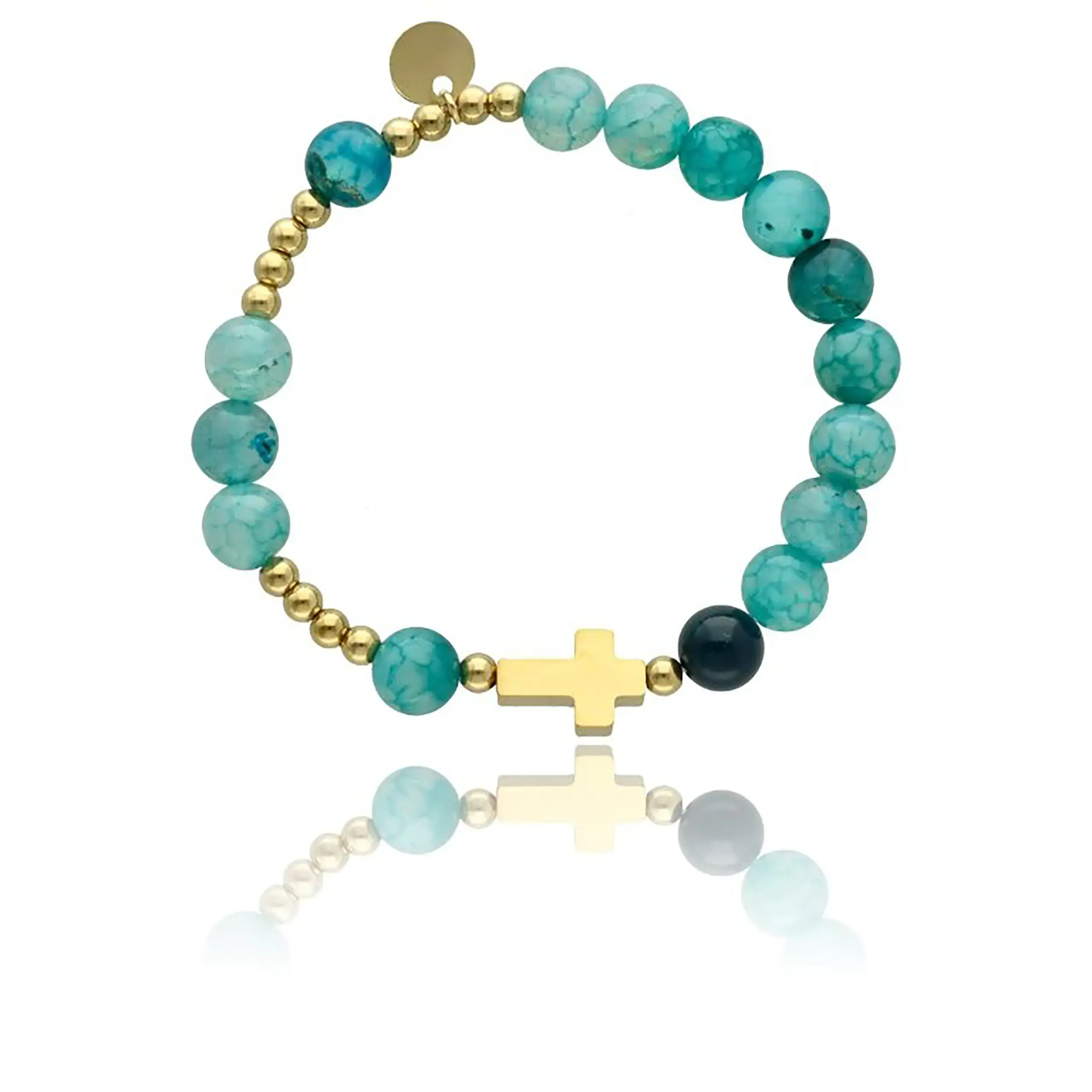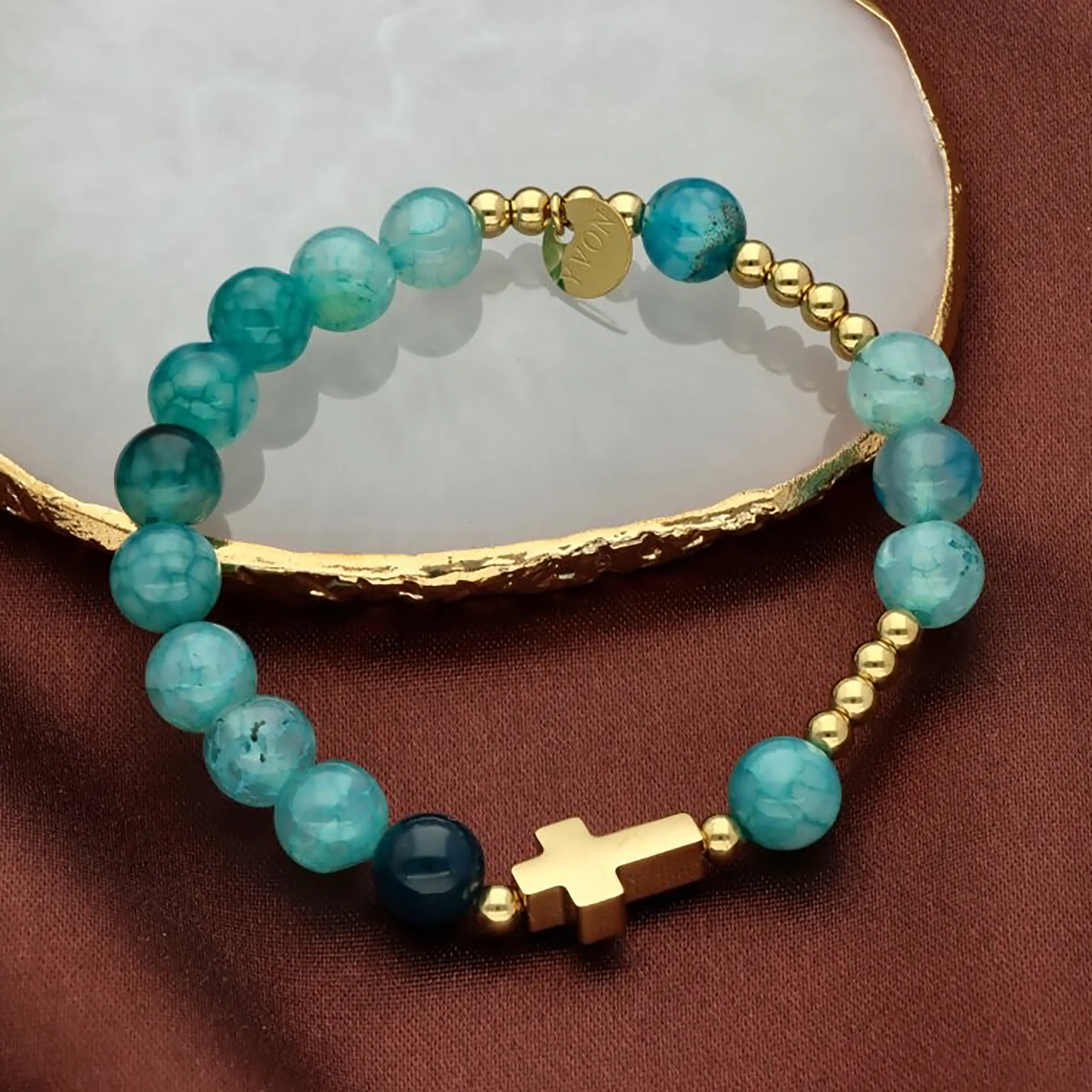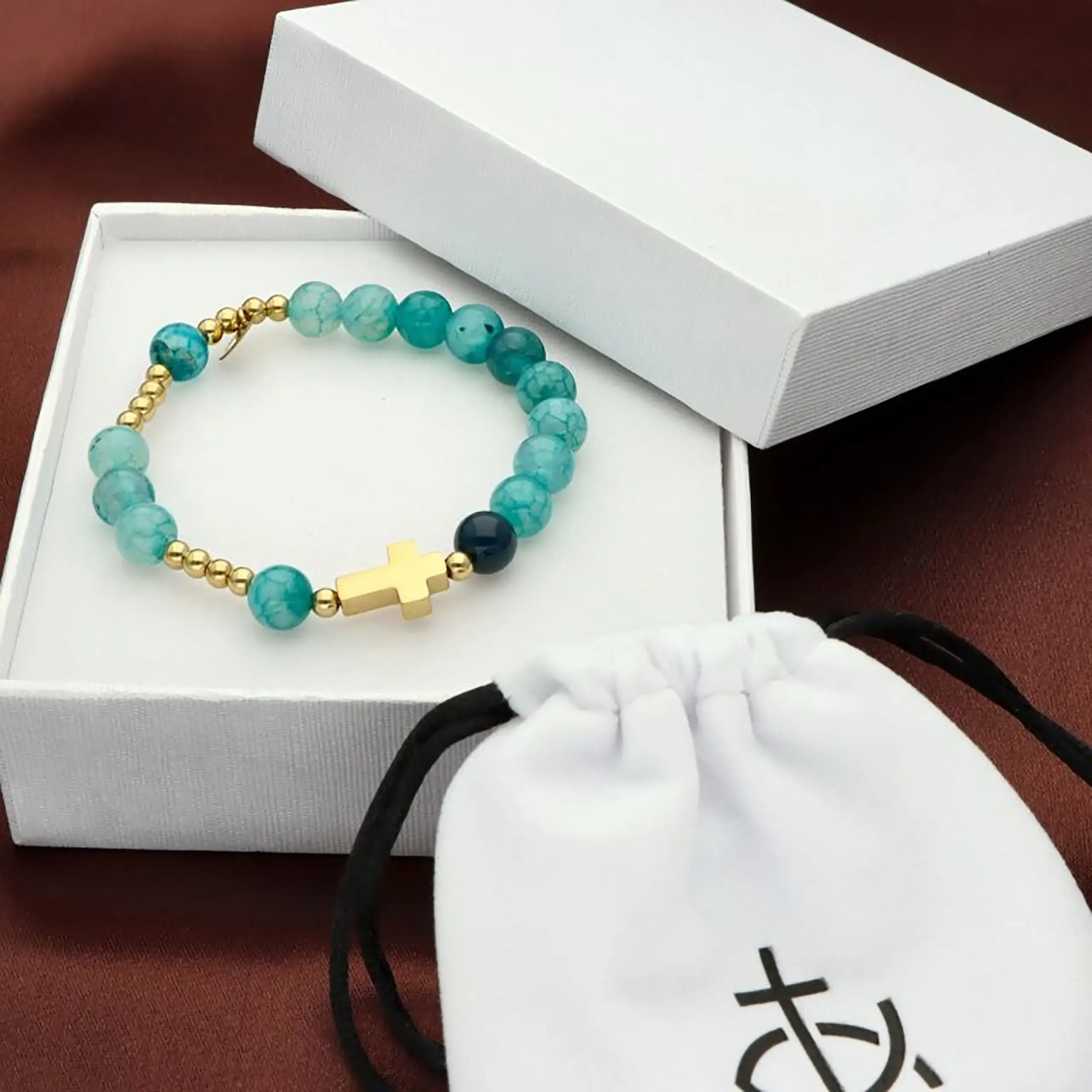Bransoletka różaniec wykonana z naturalnego kamienia agat smoczy to wyjątkowe połączenie subtelnej biżuterii i religijnej symboliki. Delikatne odcienie turkusu, błękitu oraz złote detale tworzą harmonijną kompozycję, która pięknie prezentuje się na nadgarstku. To doskonały wybór dla kobiet ceniących estetykę, trwałość oraz znaczenie płynące z noszenia symboli wiary.