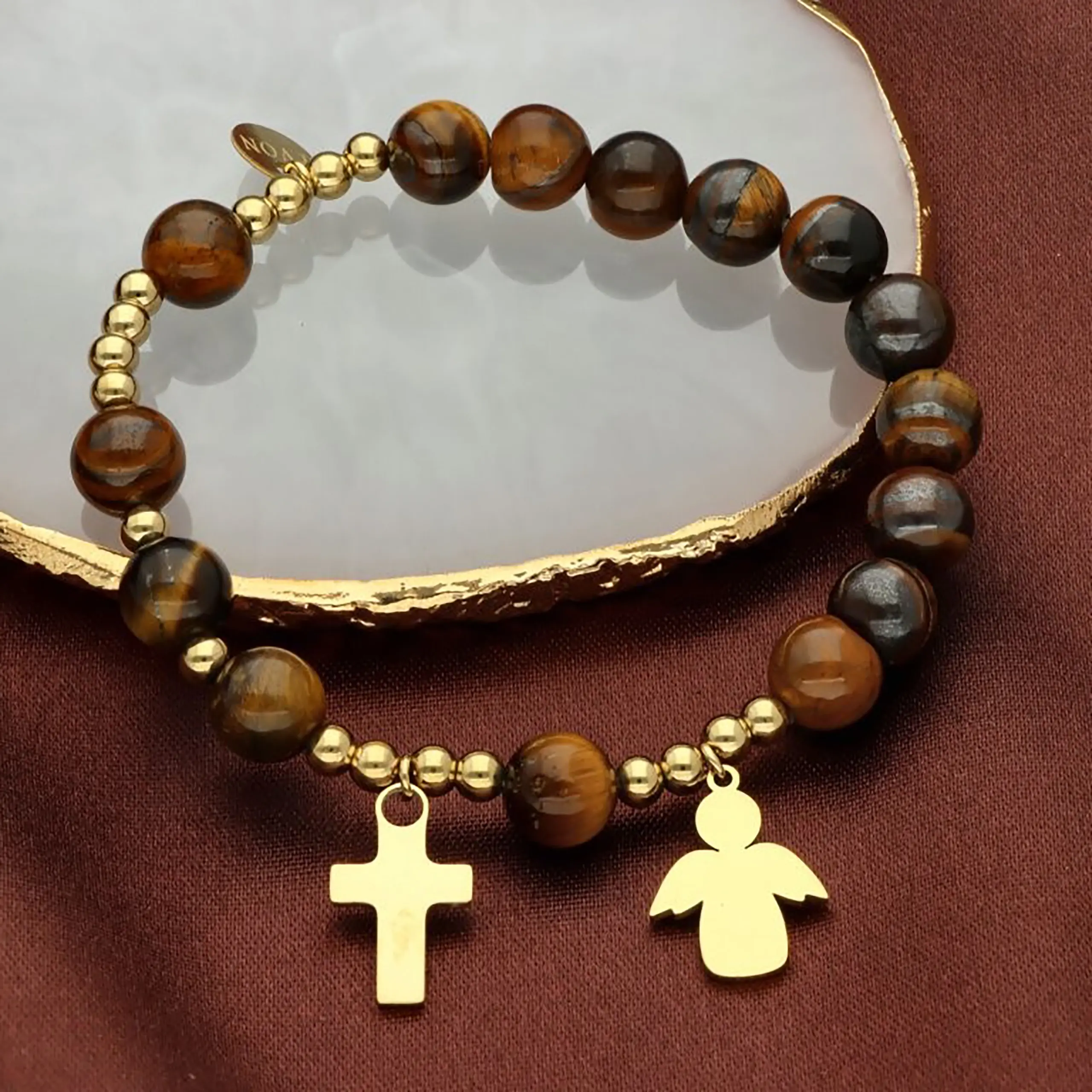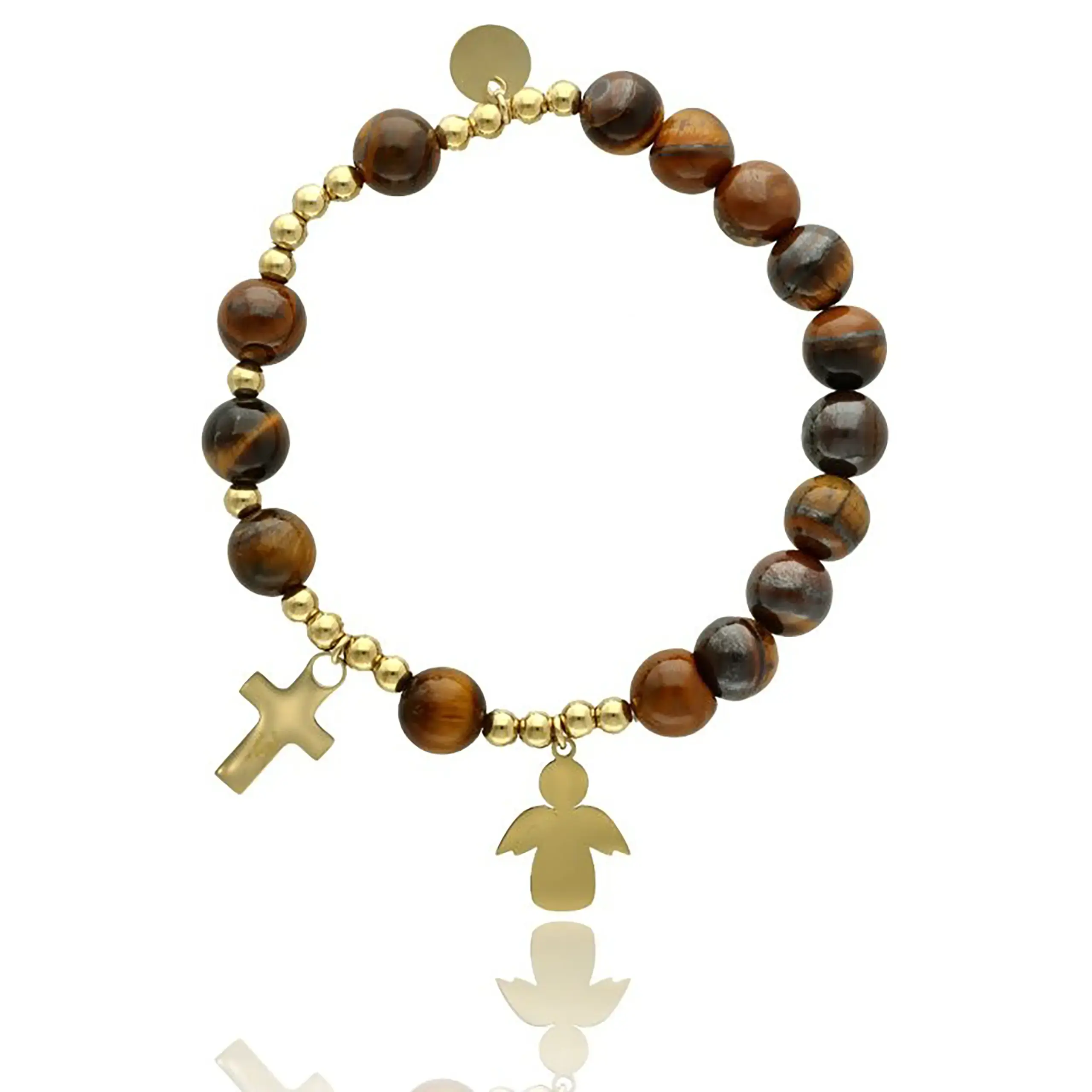 Bransoletka różaniec z tygrysiego oka ZŁOTY KRZYŻYK ANIOŁEK