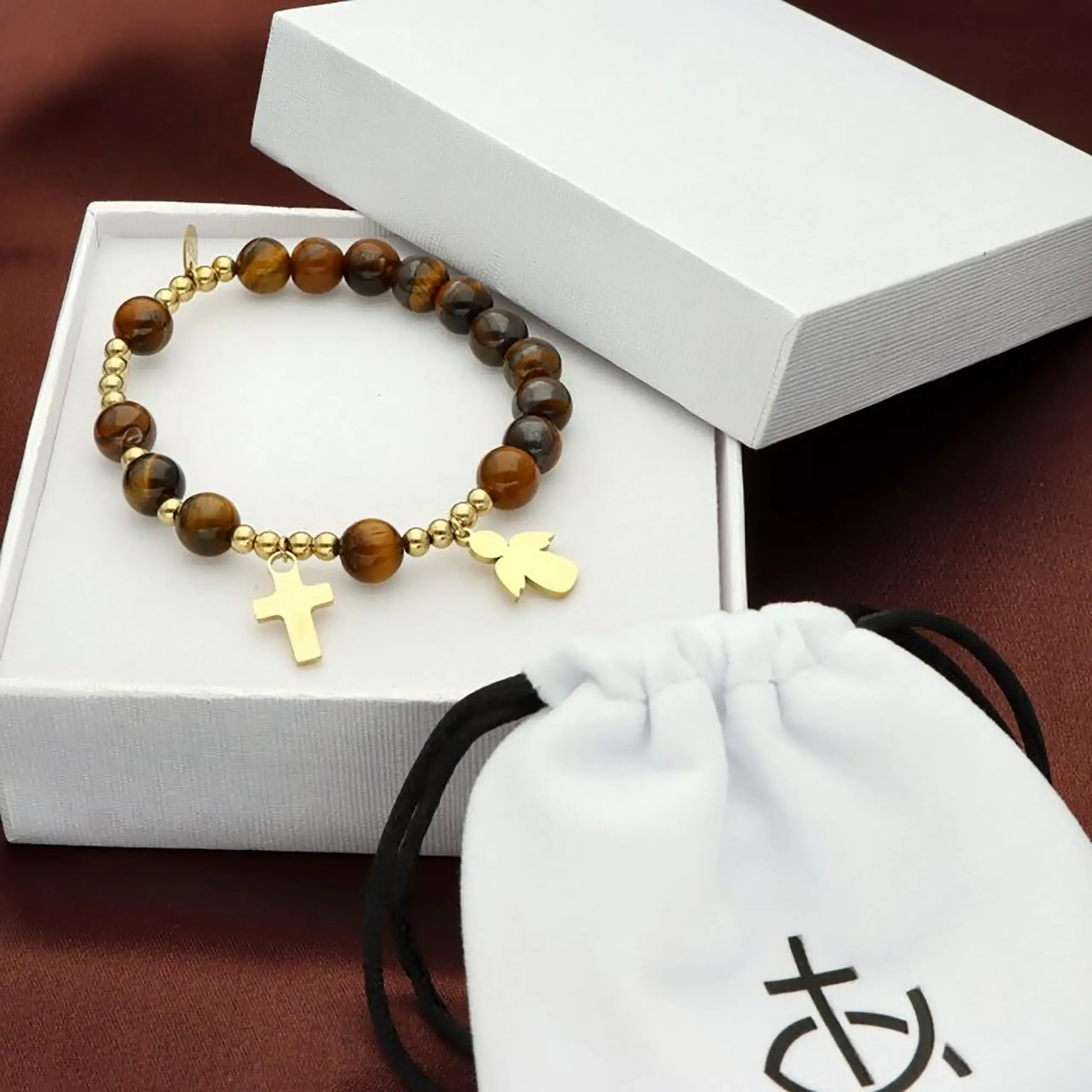 Bransoletka różaniec wykonana z naturalnego kamienia tygrysie oko brązowe to połączenie eleganckiej biżuterii i wyraźnego symbolu wiary. Starannie dobrane koraliki w odcieniach brązu, karmelu, grafitu i złota pięknie prezentują się na nadgarstku, a zawieszki w formie krzyżyka i aniołka ze stali szlachetnej podkreślają religijny charakter produktu. To doskonały wybór dla osób, które chcą mieć wartości blisko siebie każdego dnia oraz nosić subtelny różaniec na rękę.