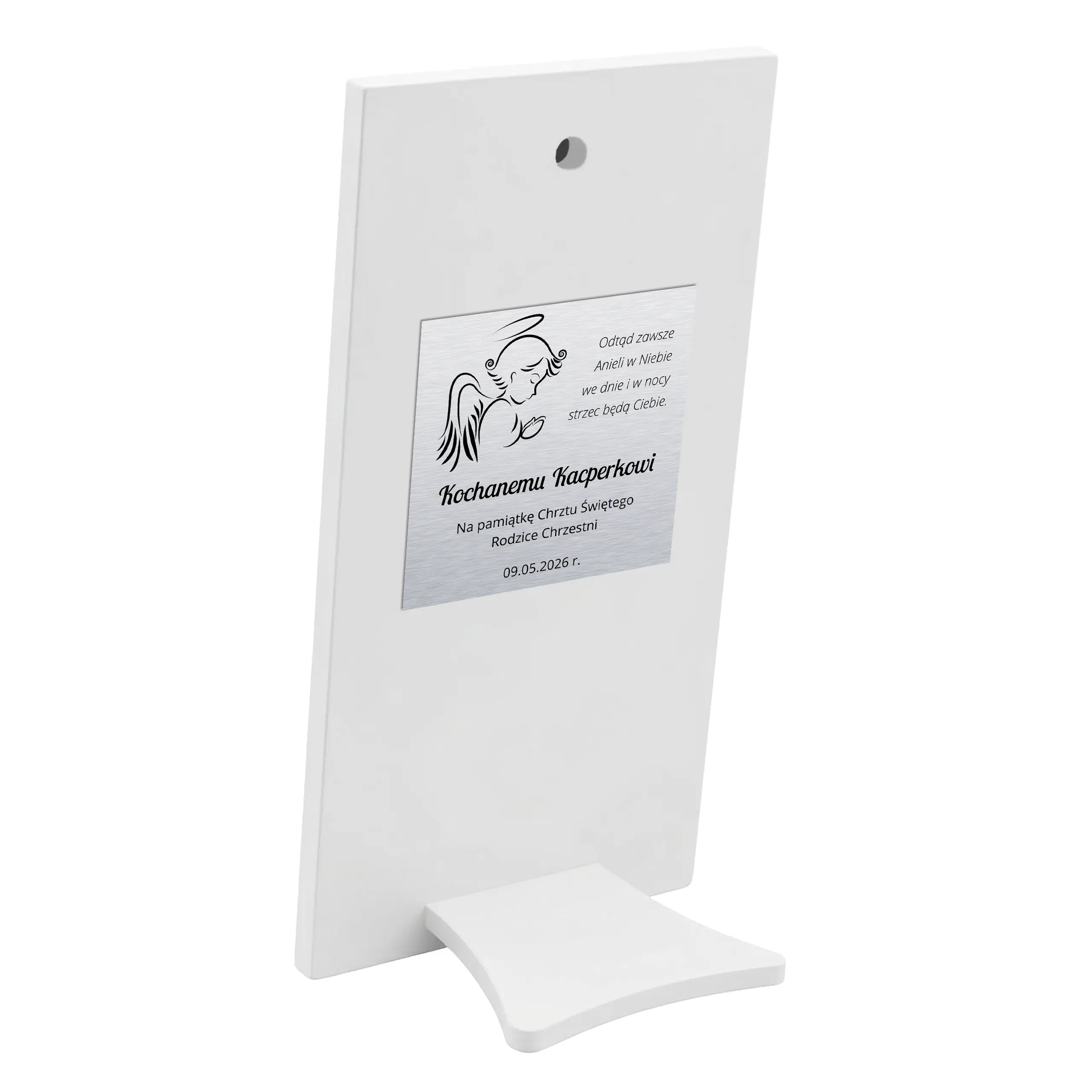 Dzięki solidnemu wykonaniu i eleganckiej formie ta pamiątka na Chrzest może być ustawiona na półce, komodzie lub zawieszona na ścianie w pokoju dziecka. Doskonale sprawdzi się jako prezent na Chrzest dla chłopca od rodziców chrzestnych, dziadków lub bliskiej rodziny. Personalizowana dedykacja sprawia, że prezent nabiera wyjątkowego znaczenia i pozostaje pamiątką na długie lata.