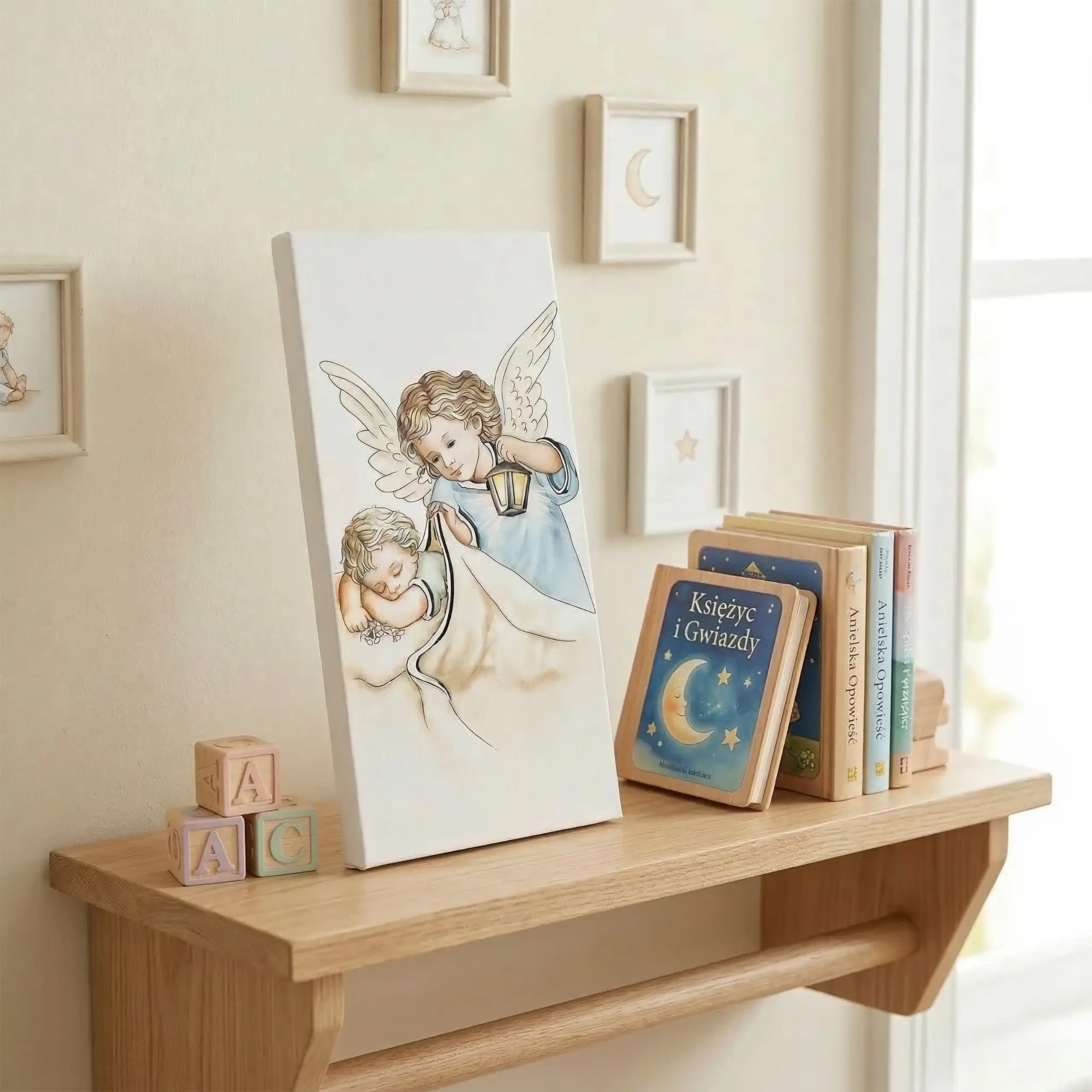 Przedstawienie Anioła Stróża trzymającego latarenkę i czuwającego nad dzieckiem tworzy spokojną, pełną ciepła kompozycję. Jasne skrzydła anioła, delikatne rysy twarzy oraz subtelne cieniowanie nadają ilustracji wyjątkowej lekkości i harmonii. Dzięki temu obrazek anioł stróż przyciąga uwagę, jednocześnie wprowadzając do wnętrza atmosferę spokoju i bezpieczeństwa.