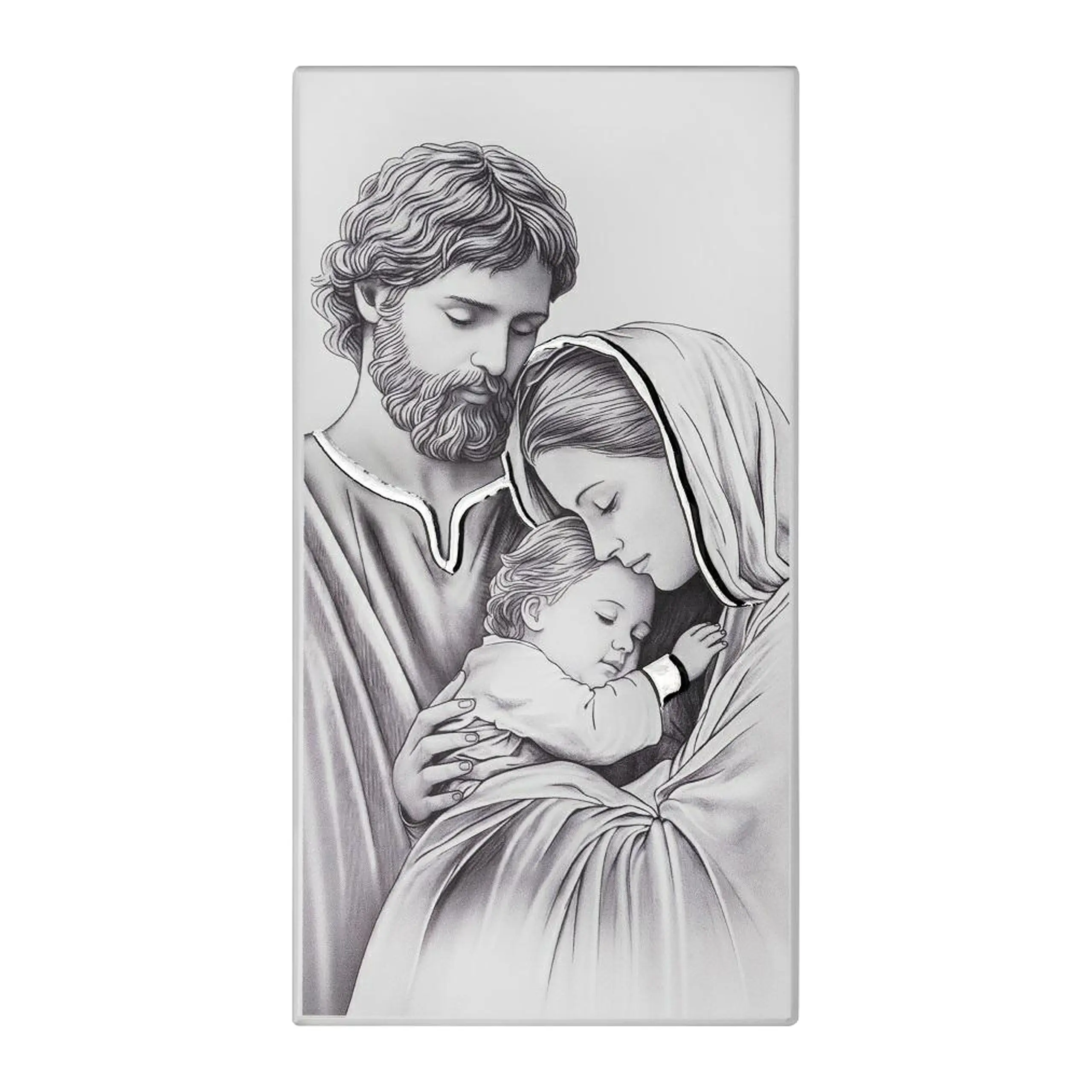 Obrazek Święta Rodzina to wyjątkowa i pełna symboliki dekoracja religijna, która doskonale sprawdzi się jako prezent na ślub lub elegancka pamiątka ślubu. Przedstawia czułą scenę Maryi, św. Józefa oraz Dzieciątka Jezus – symbol miłości, jedności i rodzinnego błogosławieństwa. Dzięki subtelnej czarno-białej stylistyce ze srebrnymi zdobieniami obrazek prezentuje się niezwykle elegancko i pasuje zarówno do klasycznych, jak i nowoczesnych wnętrz.