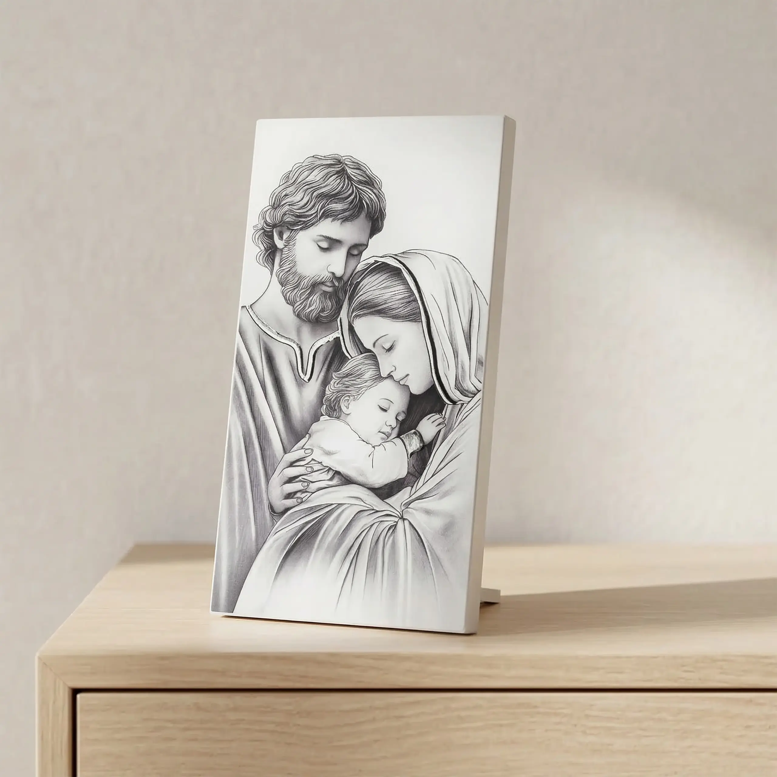 Ten obrazek na ślub został wykonany z dużą dbałością o szczegóły. Delikatne cieniowanie oraz realistyczne odwzorowanie postaci sprawiają, że scena Świętej Rodziny wygląda niezwykle subtelnie i harmonijnie. Jasna kolorystyka – połączenie bieli, srebra i szarości – nadaje mu ponadczasową elegancję, dzięki czemu obrazek pięknie prezentuje się w salonie, sypialni lub domowym miejscu modlitwy.