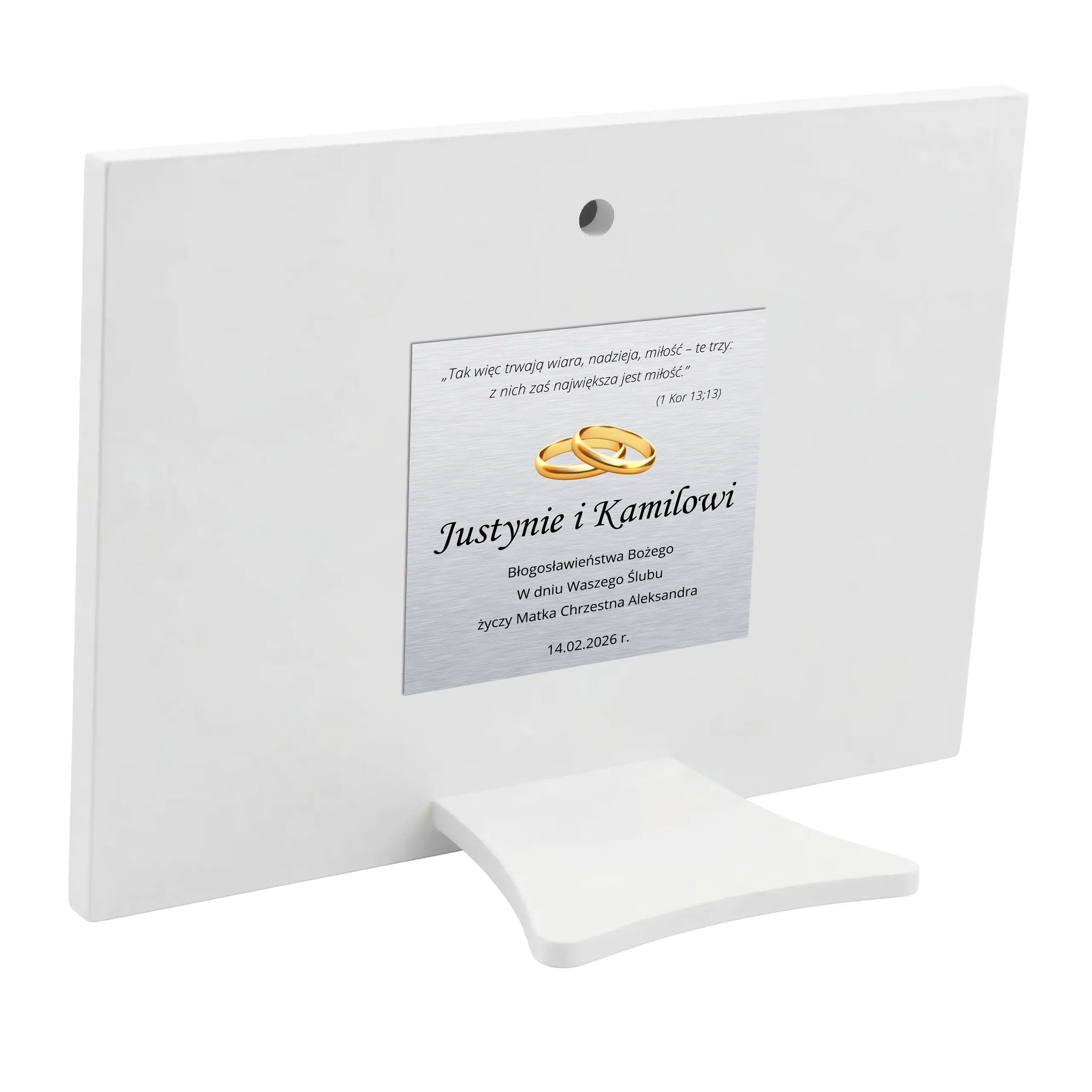 Personalizowana pamiątka ślubu sprawdzi się jako prezent od rodziców, chrzestnych, świadków, dziadków lub bliskich przyjaciół. To propozycja dla osób, które szukają upominku religijnego, estetycznego i trwałego, a jednocześnie niosącego ważne przesłanie. Dzięki możliwości ustawienia na komodzie, półce lub zawieszenia na ścianie obrazek można łatwo dopasować do domowej przestrzeni.