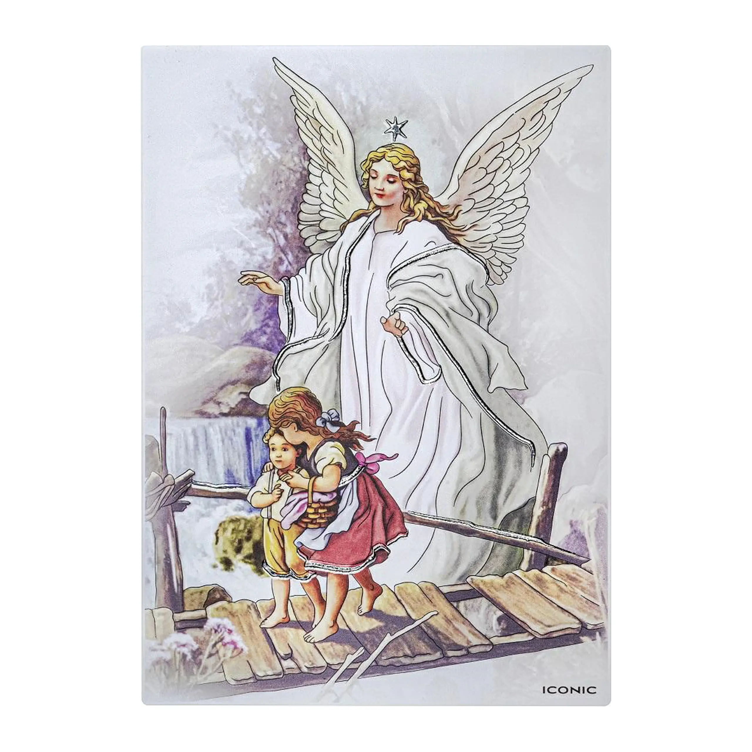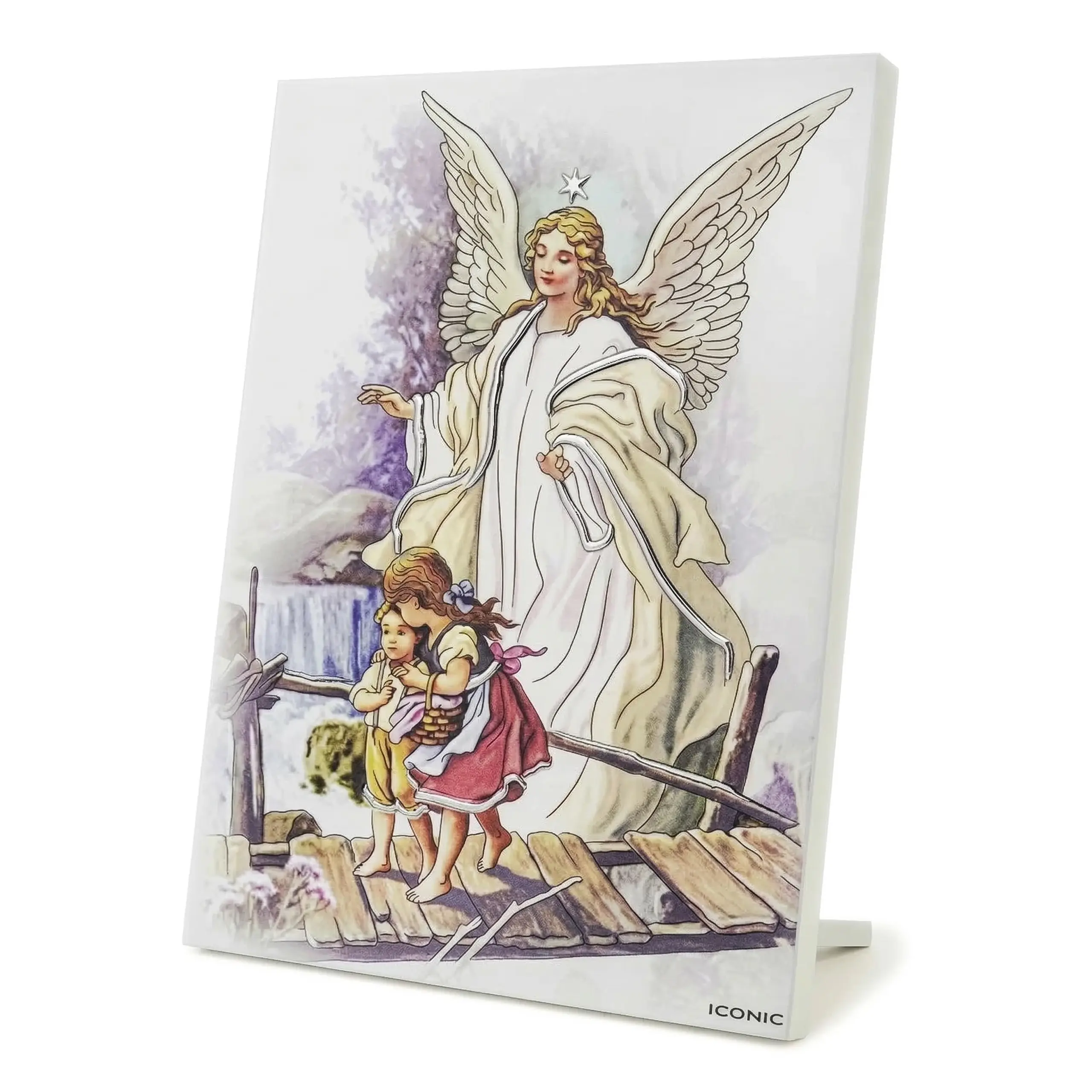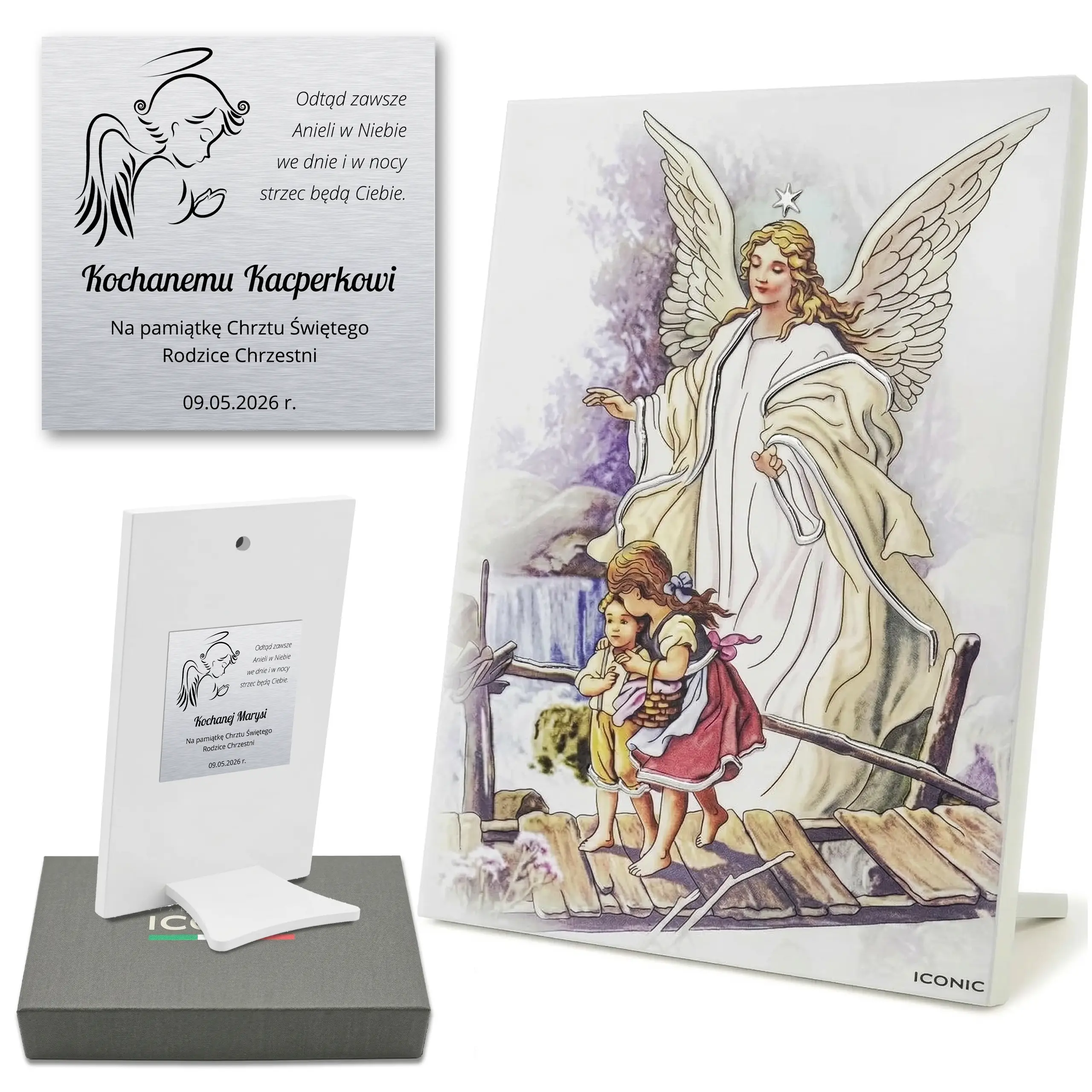 Elegancka pamiątka chrztu świętego z grawerem w formie stylowego obrazka z motywem Anioła Stróża to wyjątkowy sposób na upamiętnienie jednego z najważniejszych wydarzeń w życiu dziecka. Delikatna scena przedstawiająca anioła prowadzącego dzieci przez kładkę symbolizuje opiekę, bezpieczeństwo oraz Boże błogosławieństwo. Produkt doskonale sprawdzi się nie tylko jako prezent na chrzest z dedykacją, ale również jako ponadczasowa pamiątka na narodziny lub urodziny dziecka.