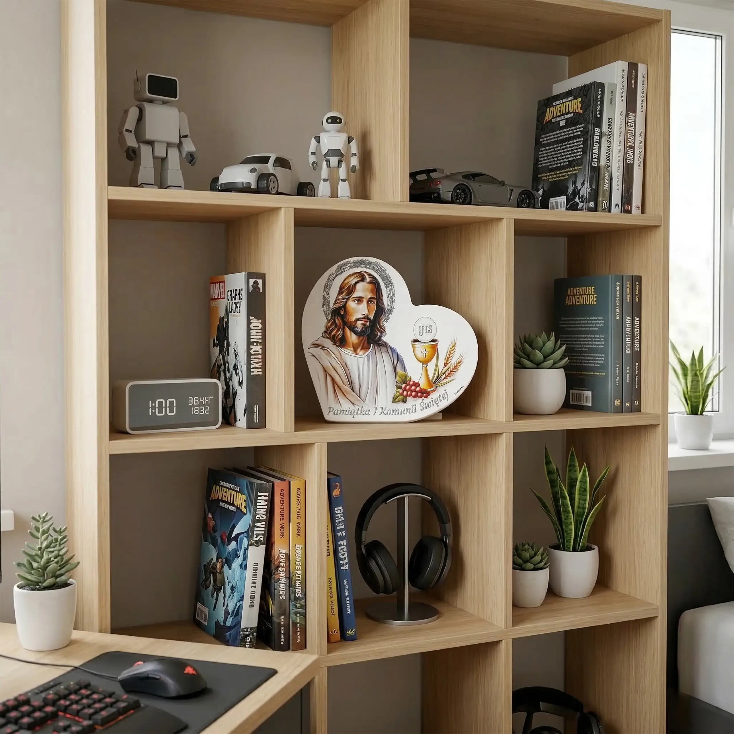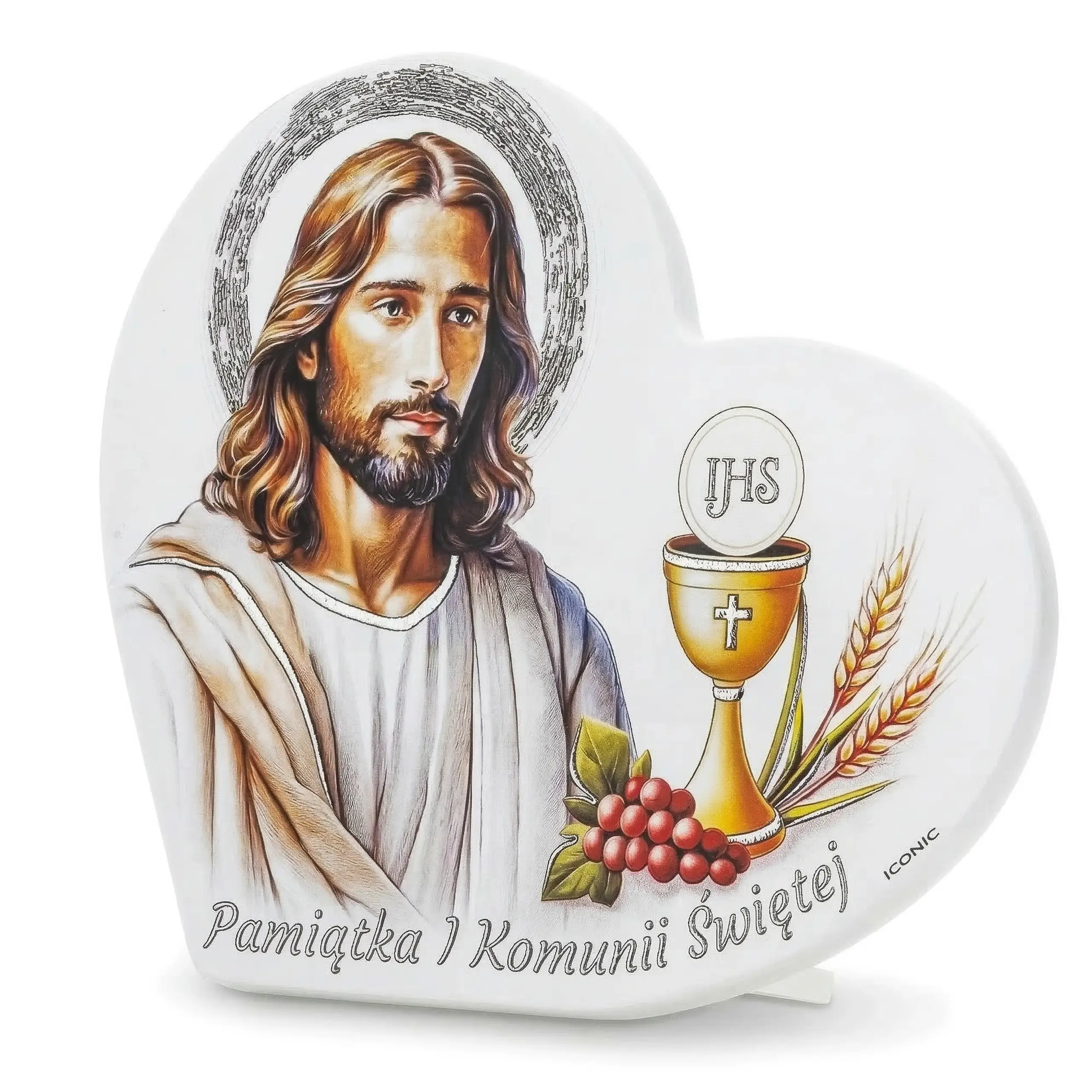 Elegancka pamiątka komunii świętej w formie dekoracyjnego obrazka w kształcie serca to wyjątkowy sposób na upamiętnienie jednego z najważniejszych wydarzeń w życiu dziecka. Subtelny obrazek komunijny przedstawia wizerunek Jezusa Chrystusa oraz symbolikę Eucharystii – kielich i hostię – które podkreślają duchowy charakter uroczystości. Dzięki możliwości personalizacji staje się to niepowtarzalny prezent na komunię, który będzie towarzyszył dziecku przez długie lata jako symbol wiary i bliskości Boga.