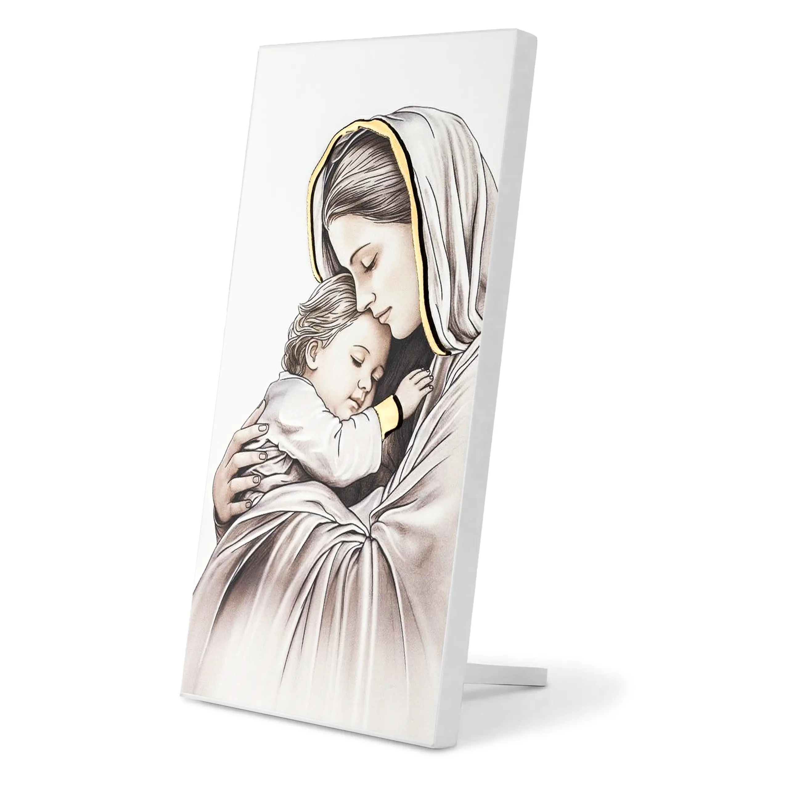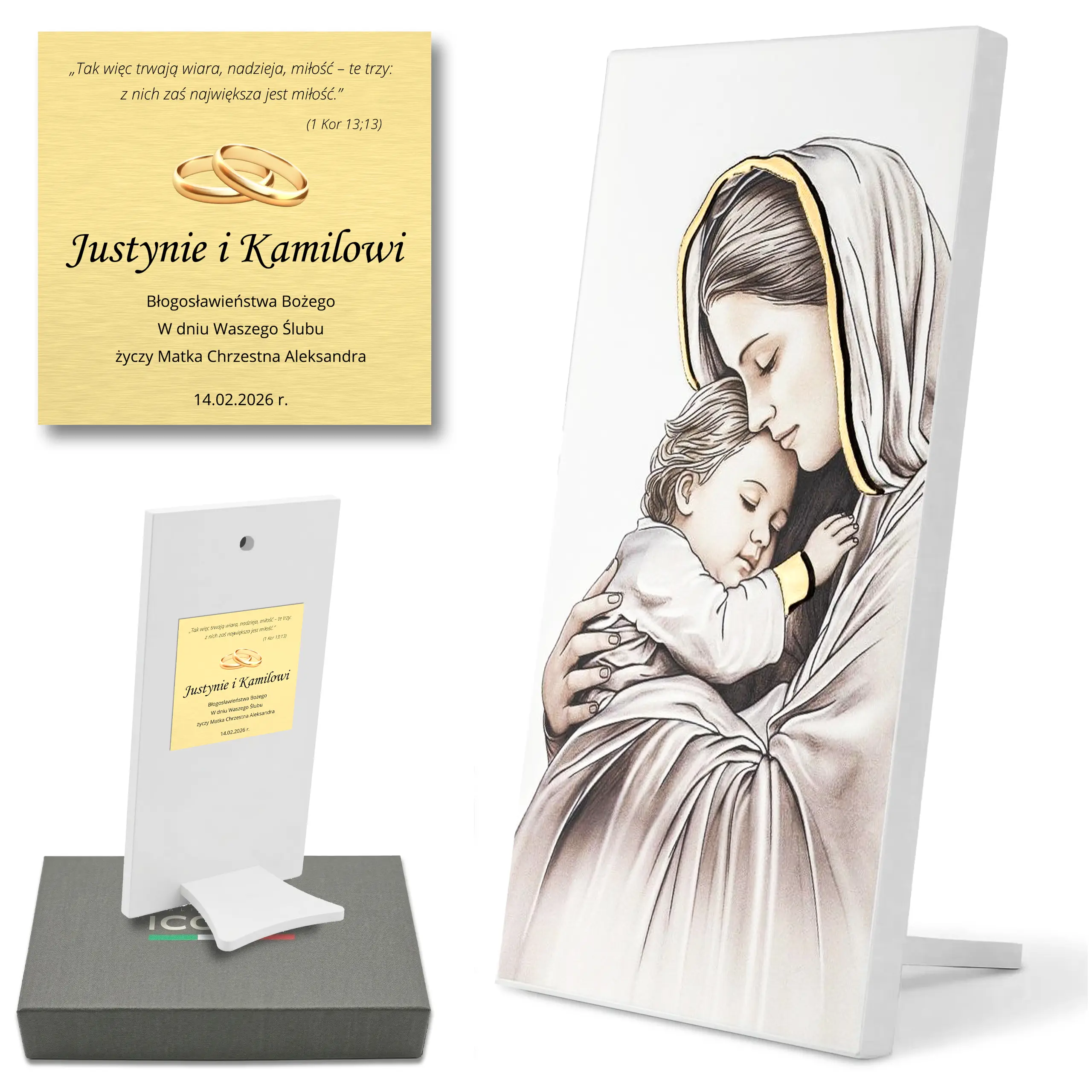 Pamiątka komunii świętej w formie eleganckiego obrazka z wizerunkiem Maryi tulącej Dzieciątko Jezus to wyjątkowy prezent o głębokiej symbolice. Motyw Matki Bożej symbolizuje miłość, opiekę oraz duchowe bezpieczeństwo, dlatego doskonale podkreśla znaczenie sakramentu Pierwszej Komunii Świętej.
