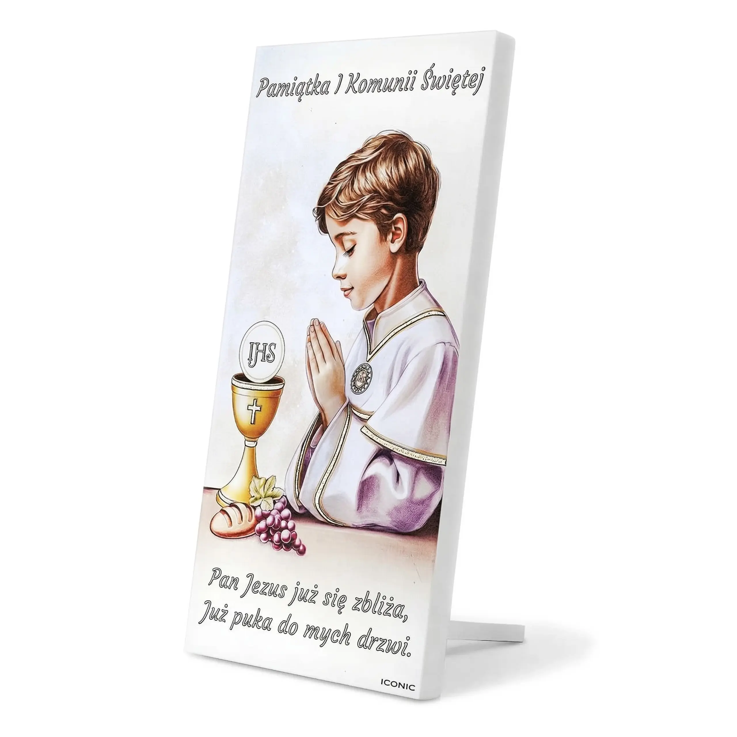 Na froncie znajduje się wizerunek modlącego się dziecka, kielich z hostią IHS oraz symbole eucharystyczne, takie jak chleb i winogrona. Z tyłu umieszczono miejsce na personalizowaną tabliczkę z grawerem zawierającym imię dziecka, datę uroczystości oraz dedykację. Całość wykonana jest w jasnej, eleganckiej stylistyce, która pasuje zarówno do pokoju dziecka, jak i do klasycznych wnętrz.