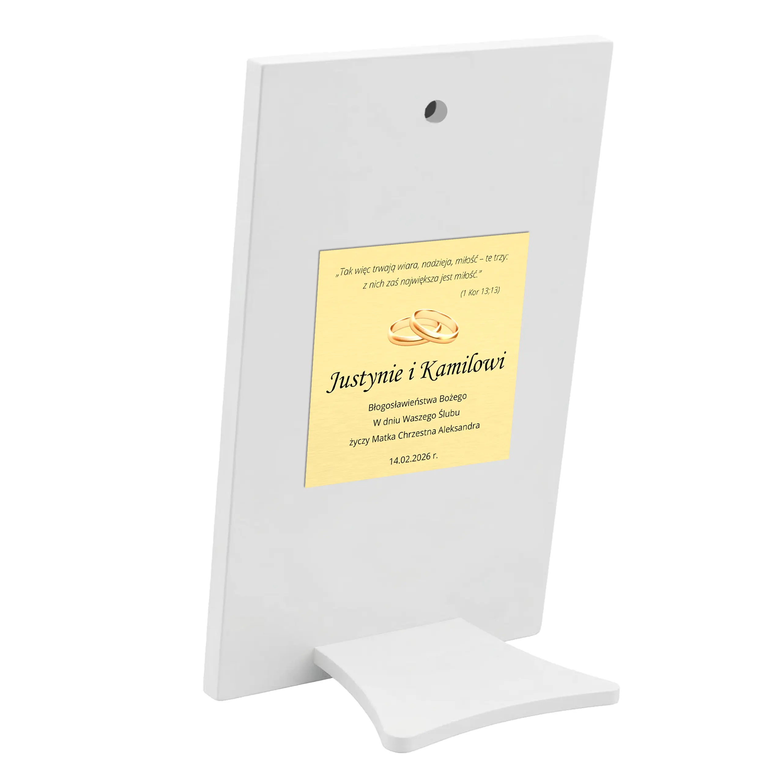 Na odwrocie znajduje się elegancka tabliczka z grawerem, na której można umieścić imiona nowożeńców, datę zawarcia sakramentu małżeństwa oraz życzenia od osoby wręczającej prezent. Dzięki temu obrazek z dedykacją na ślub staje się niezwykle osobistą pamiątką, do której młoda para będzie wracać przez całe życie.