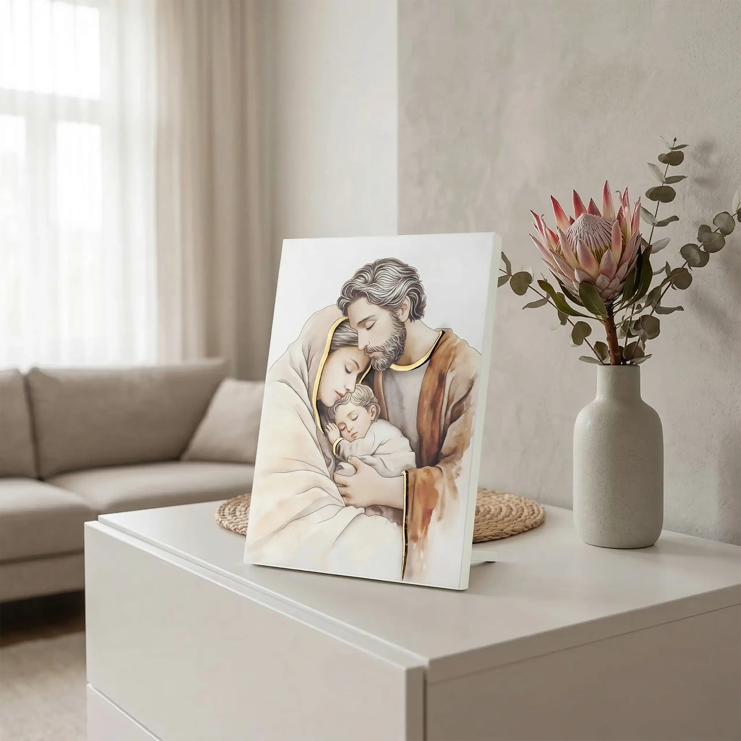 Ten obrazek na ślub został wykonany z dbałością o każdy detal. Artystyczne przedstawienie Świętej Rodziny wyróżnia się subtelnym cieniowaniem, harmonijną kolorystyką oraz delikatnymi złotymi akcentami. Kompozycja emanuje spokojem i ciepłem, dzięki czemu stanowi piękną ozdobę domu oraz wyjątkową personalizowaną pamiątkę ślubu.