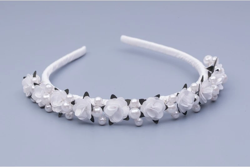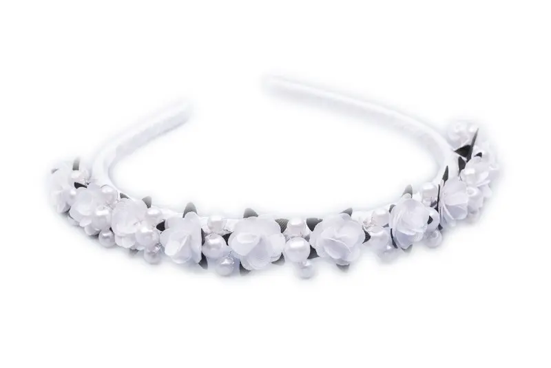 Piękna i wygodna opaska na Pierwszą Komunię Świętą dla dziewczynki. Nasza opaska z białymi kwiatuszkami z perełkami i zielonymi dodatkami to kwintesencja elegancji i uroku. Dzięki perfekcyjnemu wykonaniu ręcznemu przez polskich artystów, opaska idealnie pasuje do każdej główki dziewczynki, nie zsuwa się i zapewnia wygodę podczas całego uroczystego dnia.