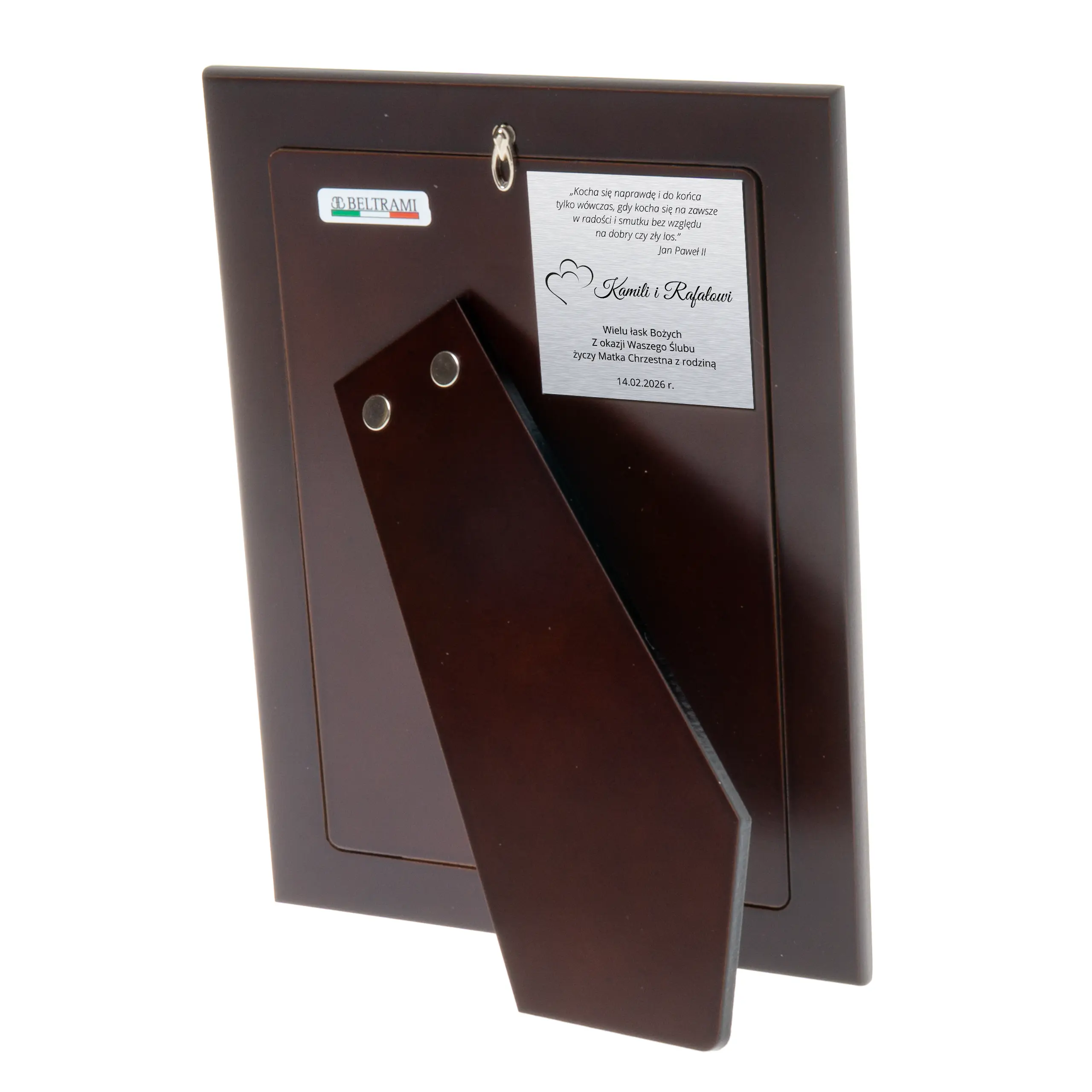 Tył ramki wykonano w eleganckim, brązowym kolorze i wyposażono w stabilną podpórkę. Ramka przeznaczona jest do ustawienia na półce, komodzie lub biurku – nie jest przeznaczona do zawieszania na ścianie.