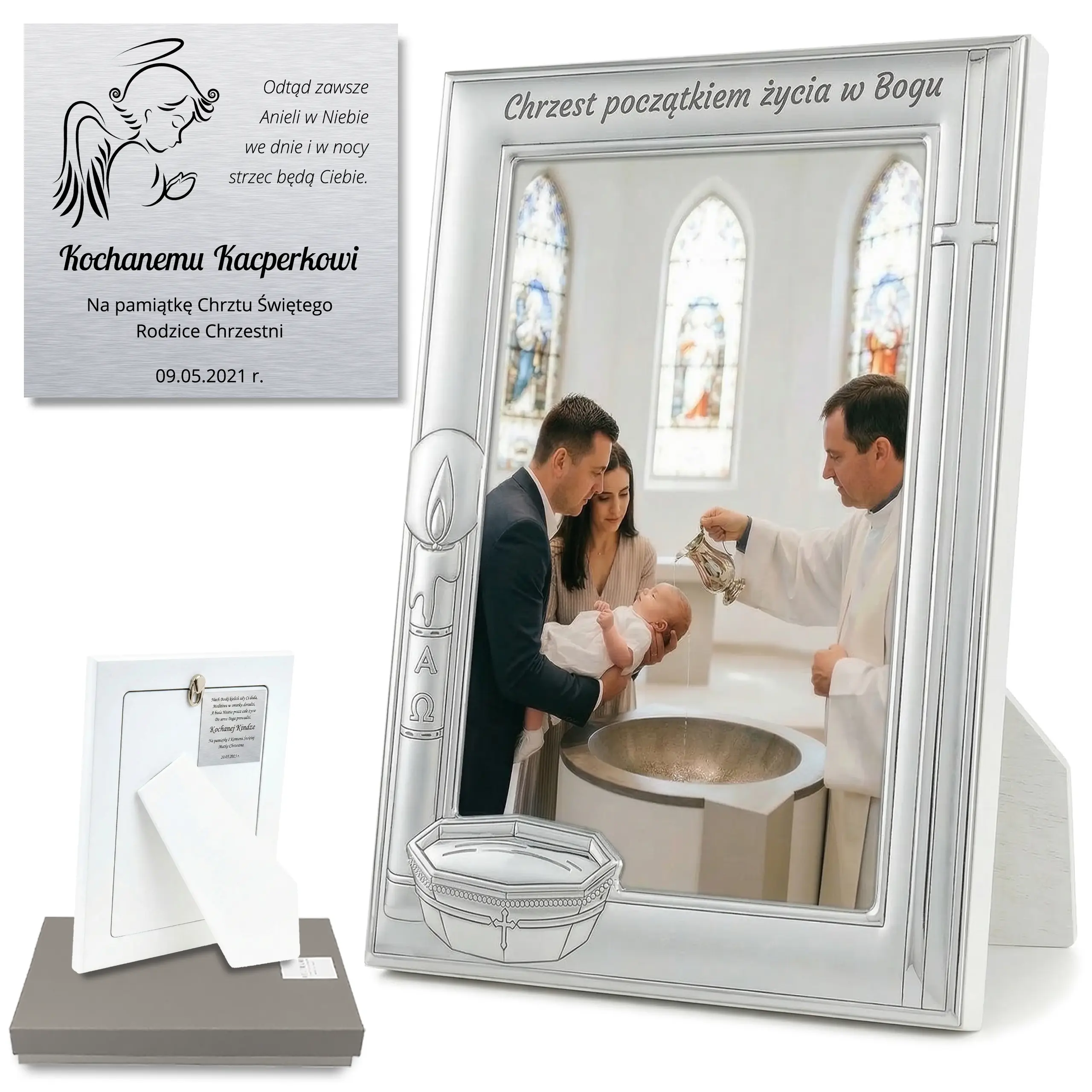 Ramka na chrzest srebrna 10x15 Z GRAWEREM pamiątka chrztu