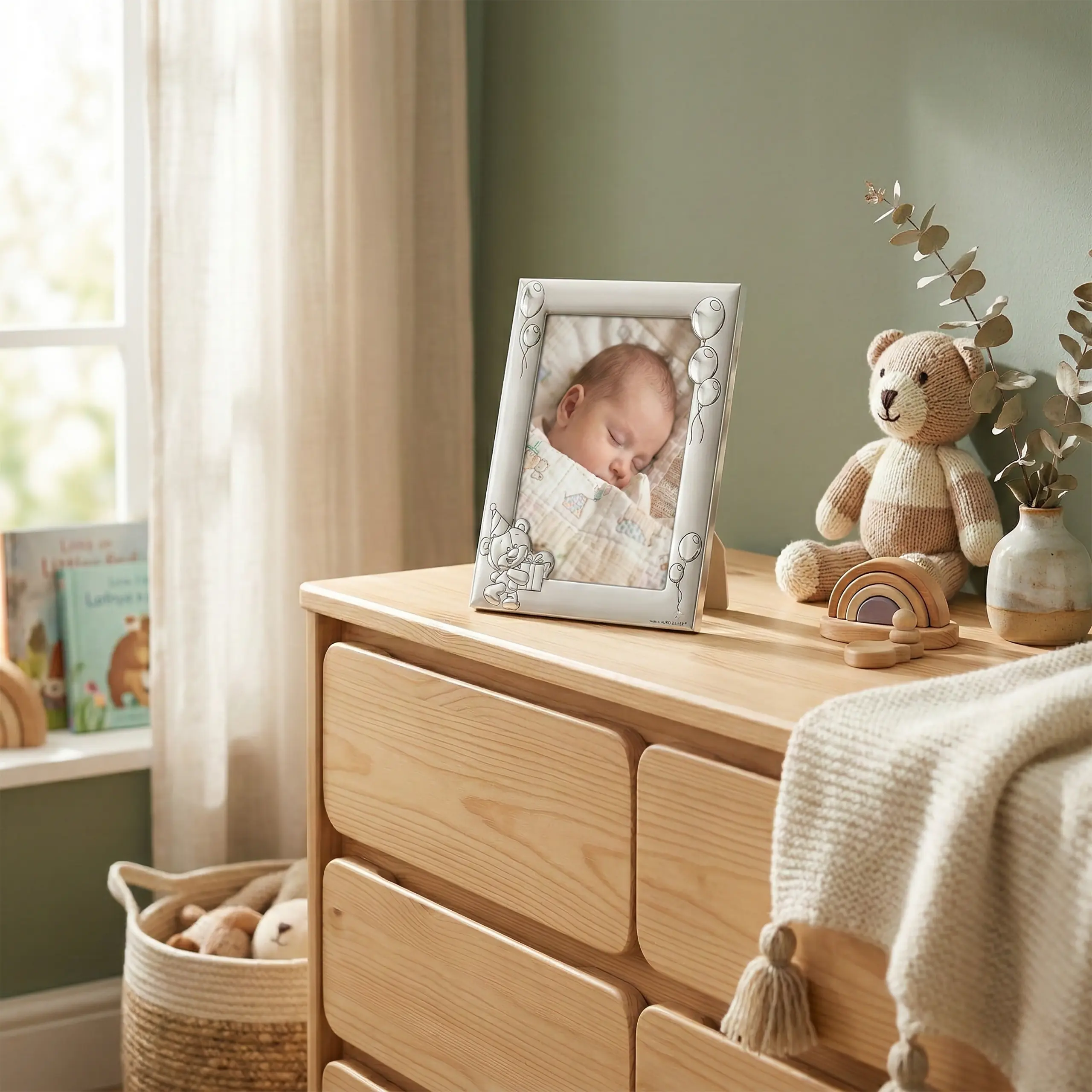 Ta ramka na chrzest dla dziecka została zaprojektowana z myślą o wyjątkowych okazjach, które zasługują na piękną oprawę. Przód ramki utrzymany jest w srebrnej tonacji, a ozdobny motyw misia z podarunkiem oraz baloników dodaje jej łagodnego, dziecięcego stylu. To model, który dobrze komponuje się z fotografiami niemowląt i małych dzieci, dlatego sprawdzi się nie tylko jako pamiątka Chrztu, ale również jako upominek z okazji narodzin.