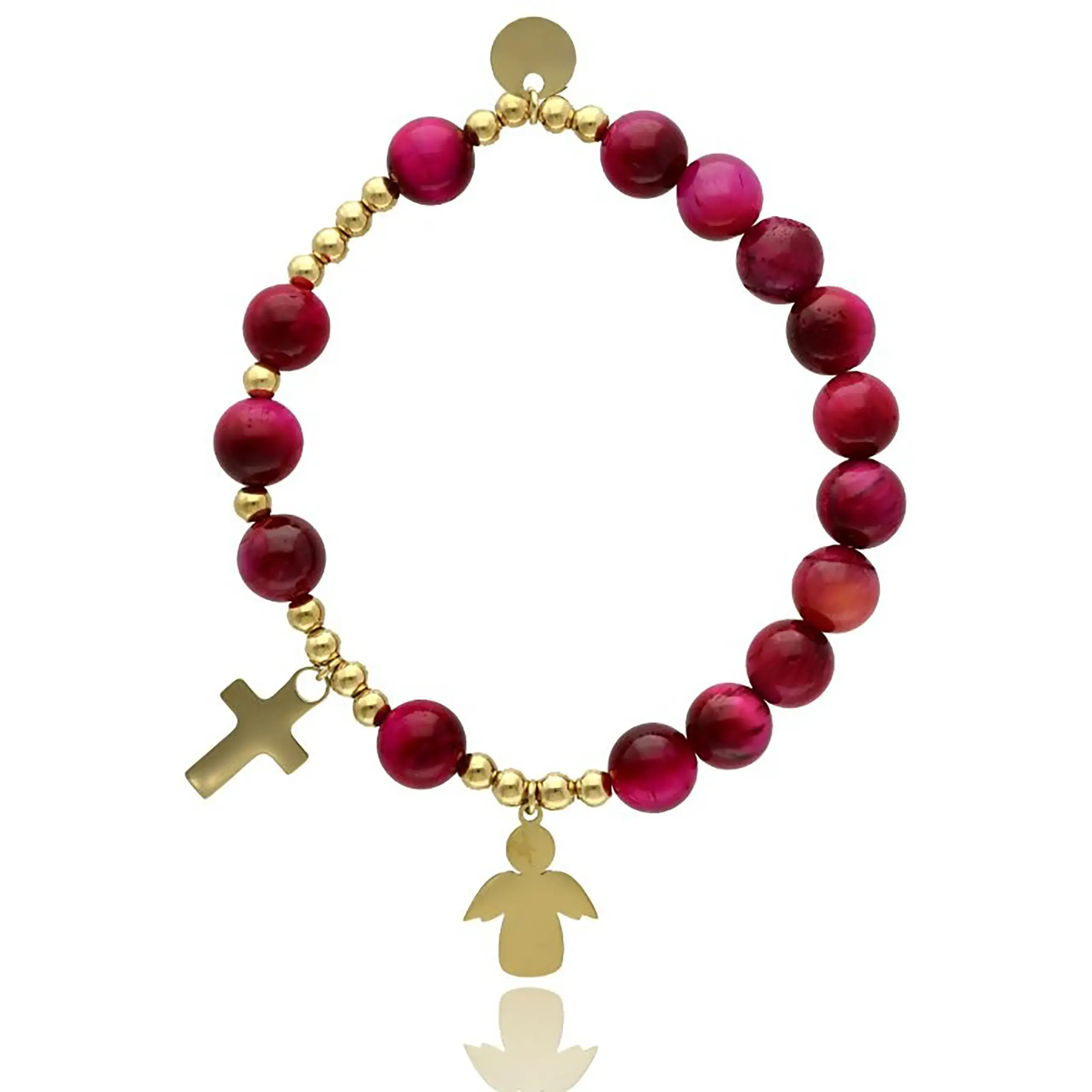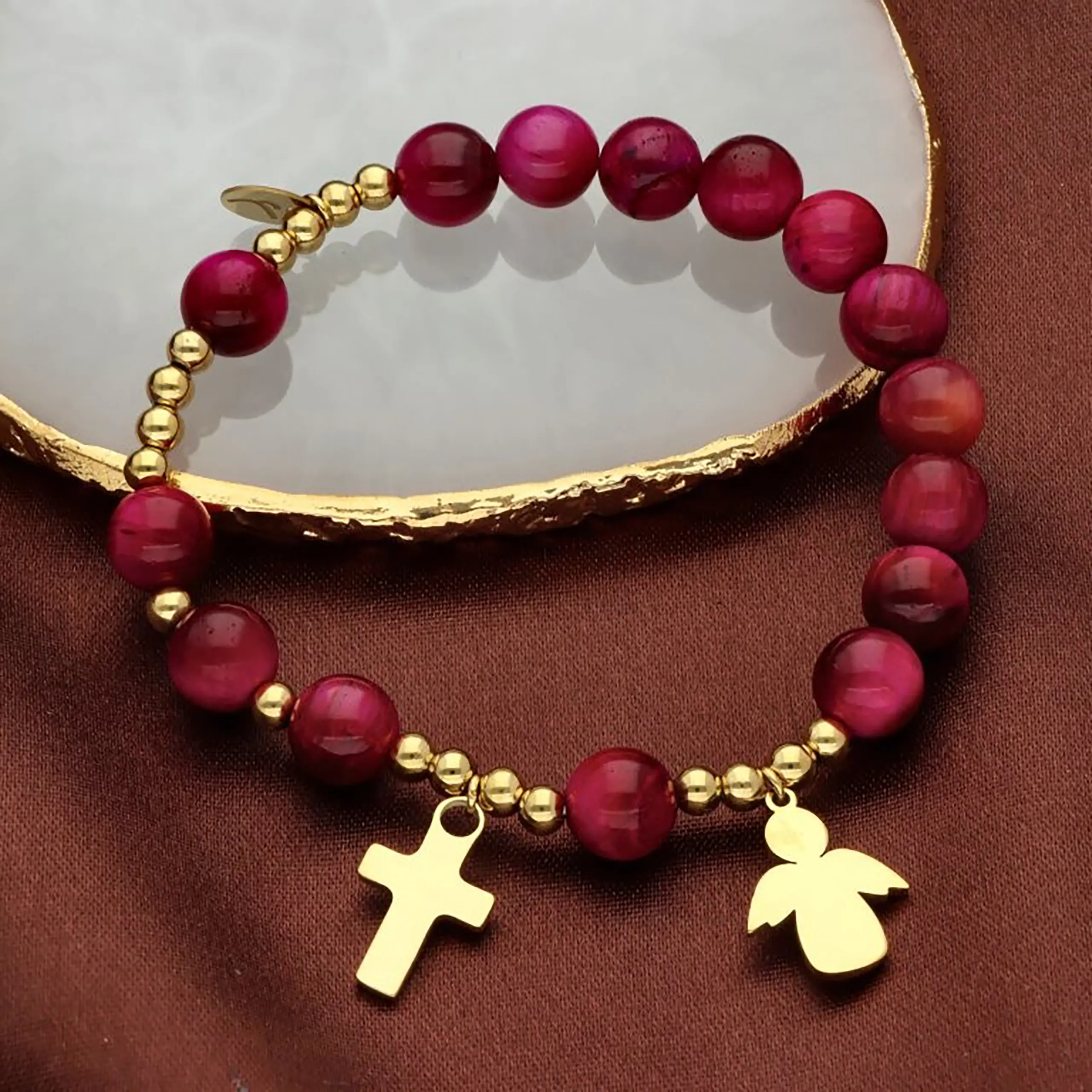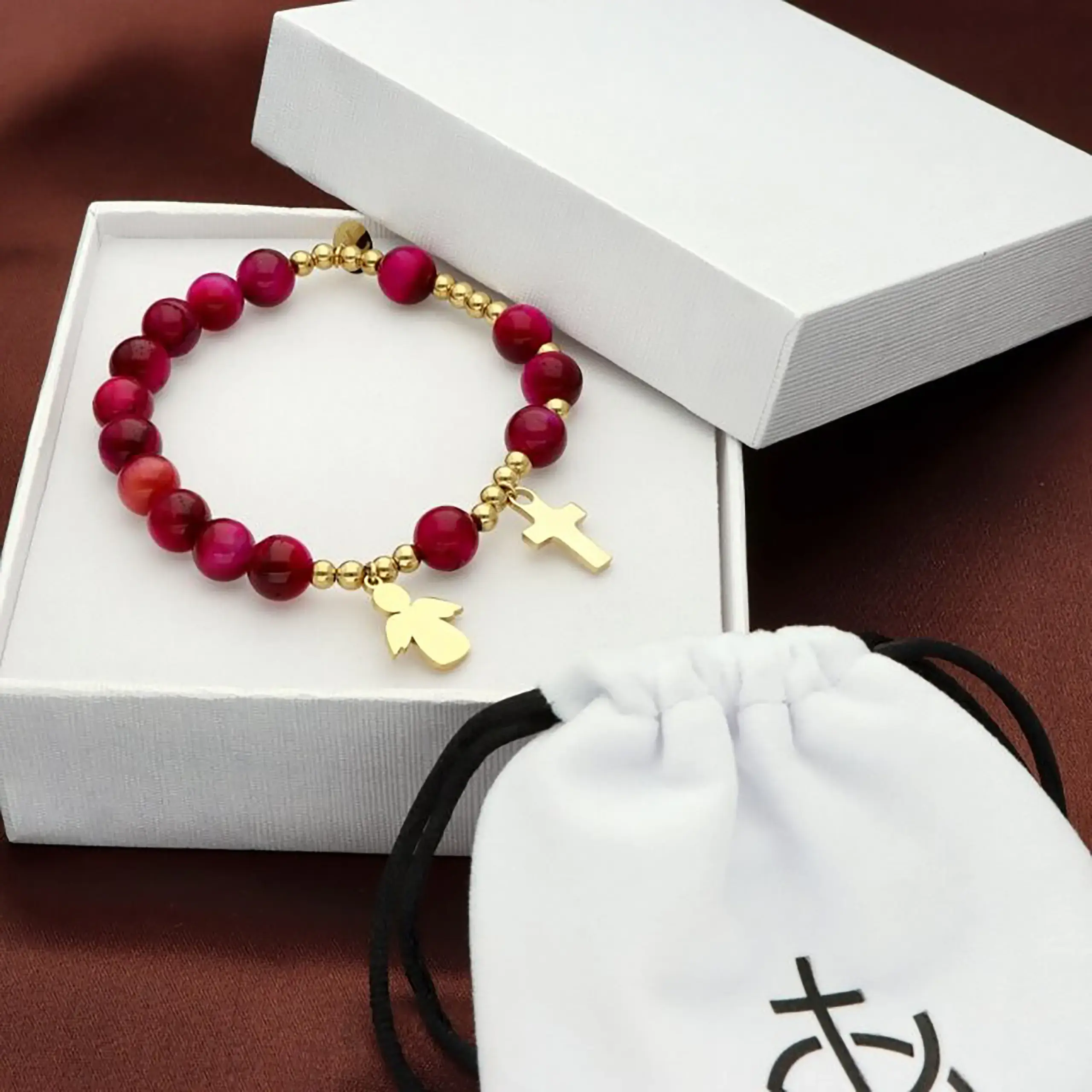 Stylowa różaniec bransoletka to wyjątkowe połączenie subtelnej biżuterii oraz religijnej symboliki. Model wykonano z kamieni naturalnych tygrysie oko różowe w pięknych odcieniach różu, bordo i malinowej czerwieni. Złote dodatki, klasyczny krzyżyk oraz zawieszka aniołka ze stali szlachetnej podkreślają elegancki charakter produktu. To doskonały wybór dla kobiet, które chcą mieć znak wiary zawsze blisko siebie.