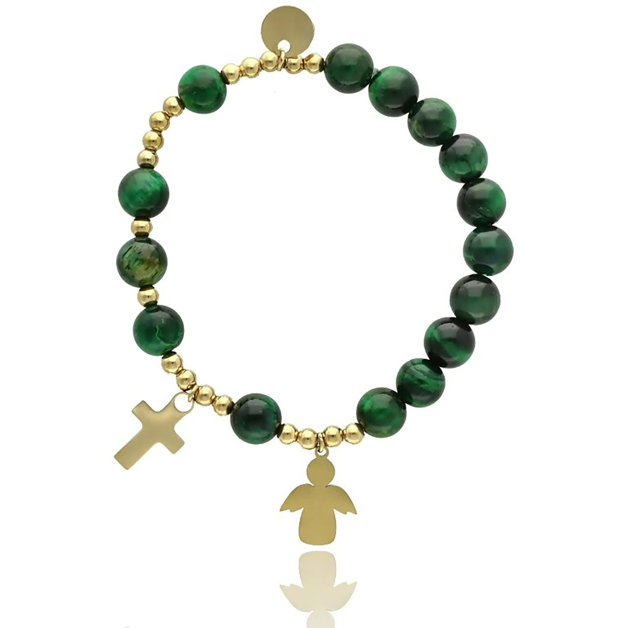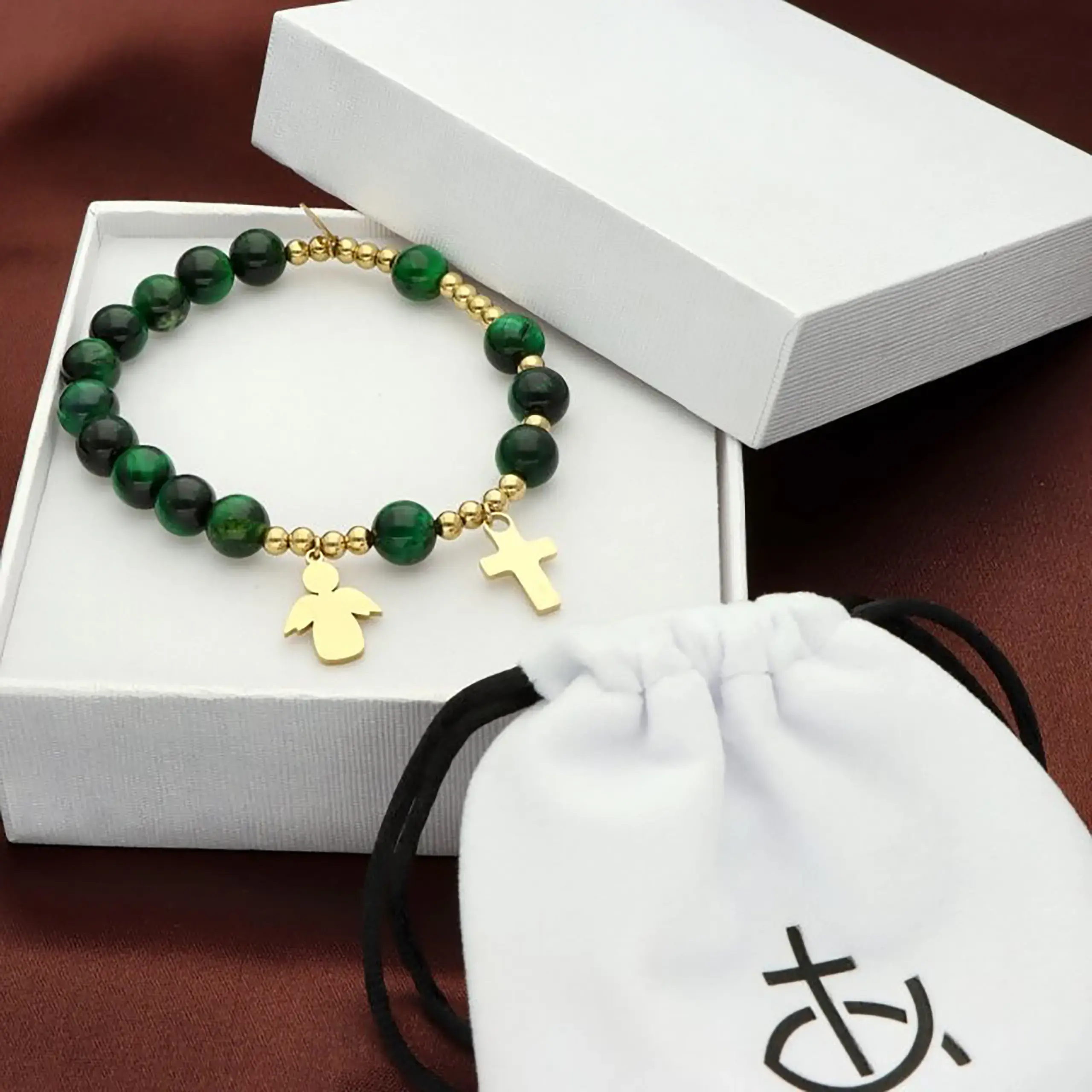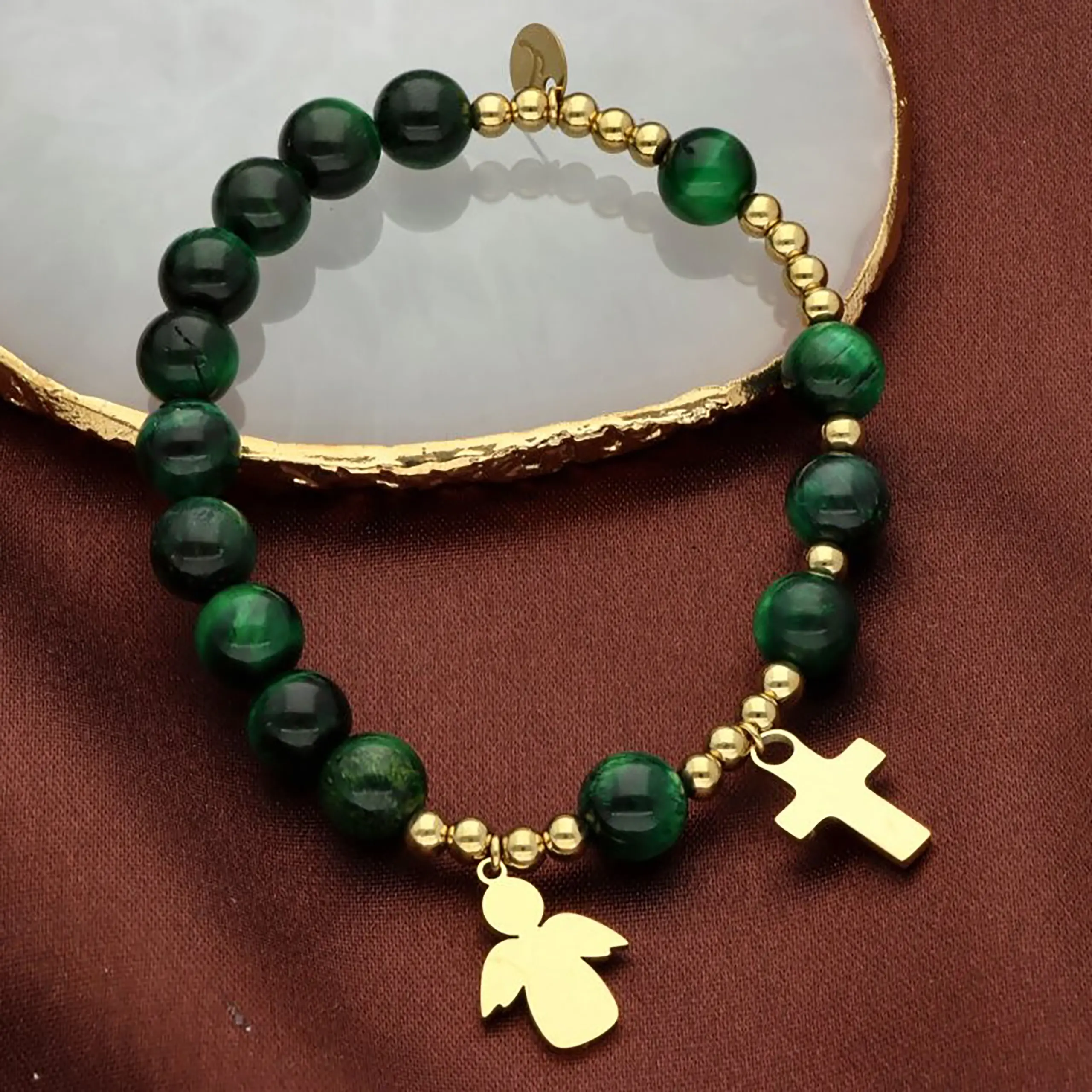 - Bransoletka religijna ze złotymi elementami – krzyżyk i zawieszka aniołka – podkreśla chrześcijański charakter produktu.