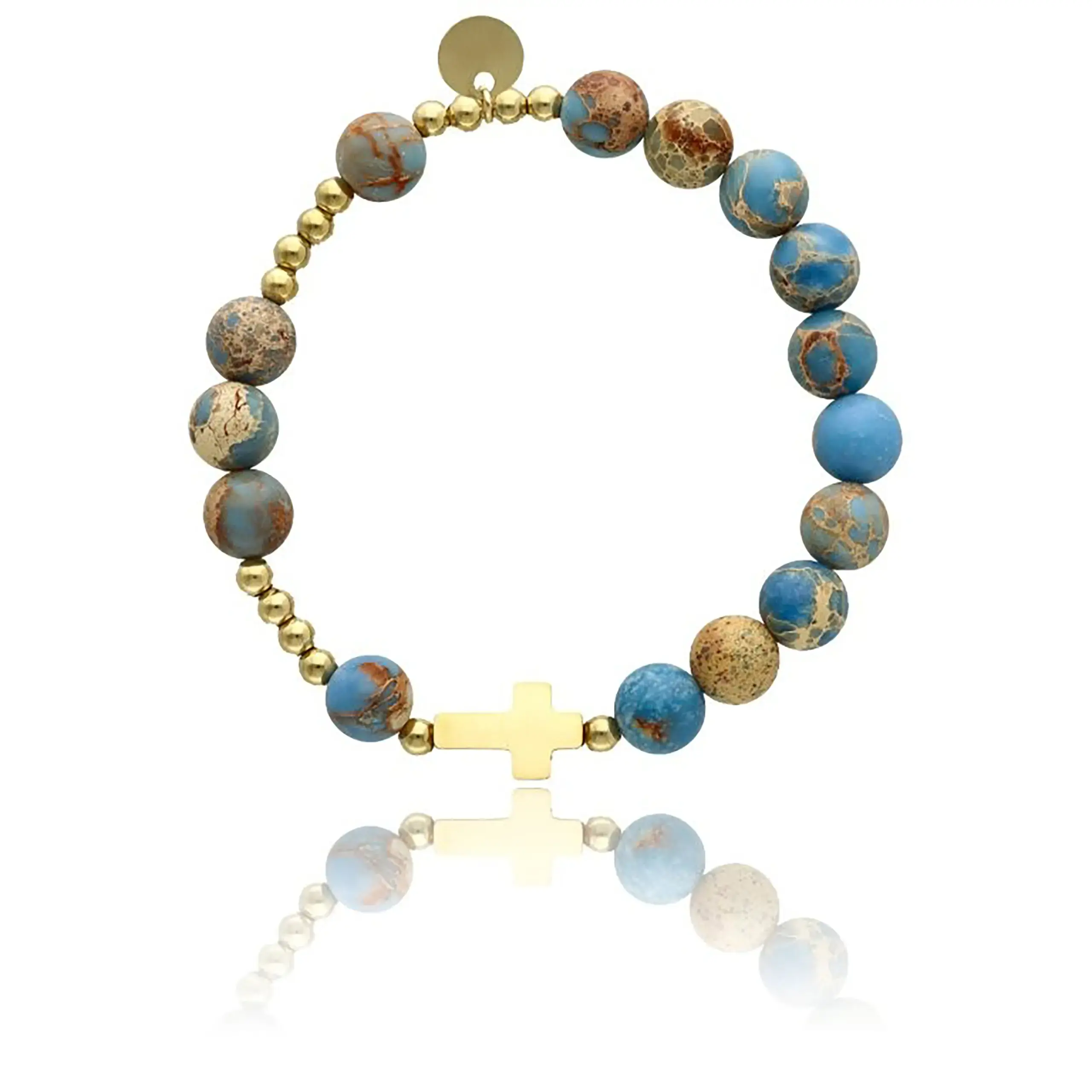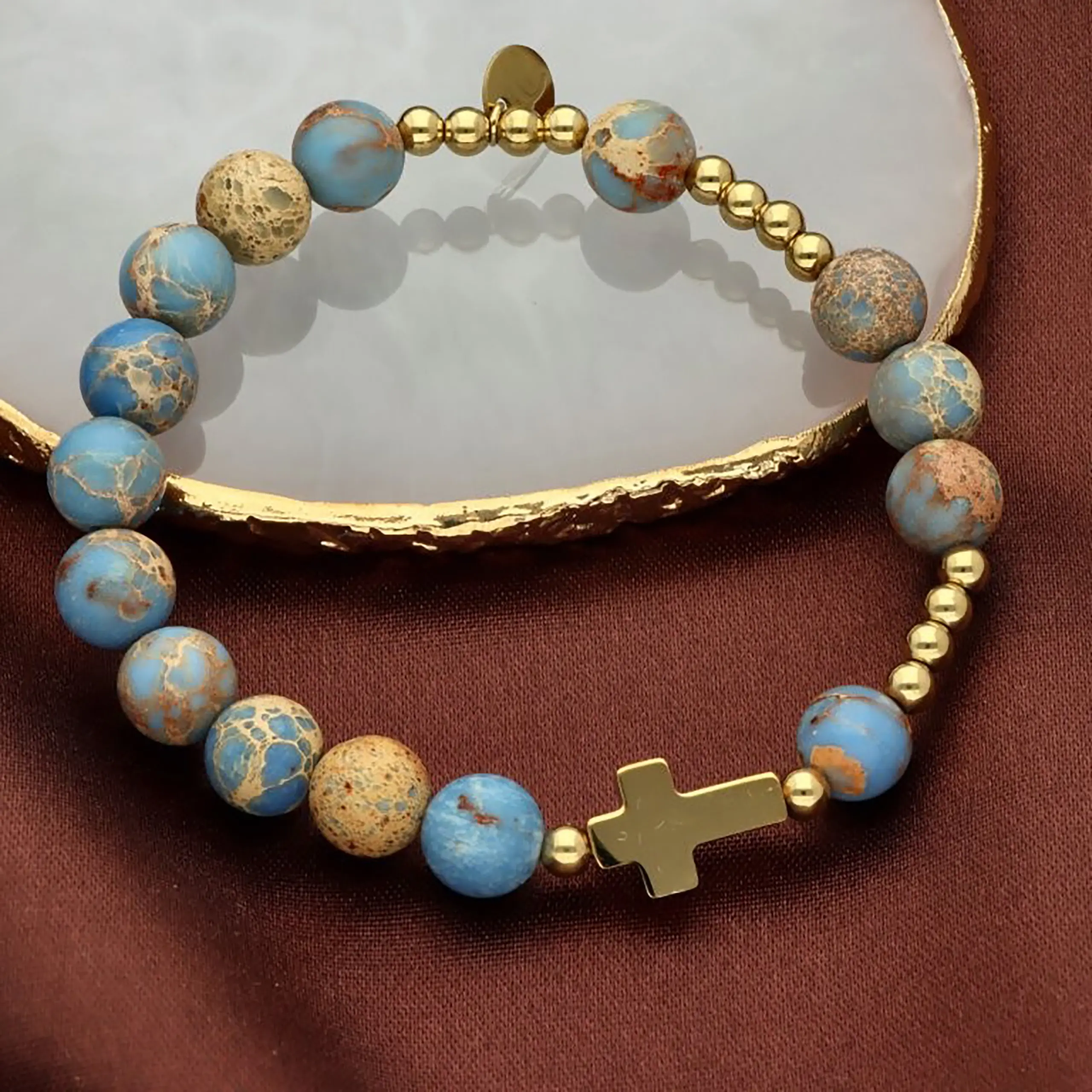 Ta bransoletka religijna sprawdzi się jako codzienny znak wiary, pamiątka ważnego wydarzenia lub elegancki prezent dla bliskiej osoby. Może towarzyszyć podczas modlitwy jako dziesiątka różańca, a jednocześnie pełnić funkcję stylowej ozdoby. Starannie dobrane koraliki w odcieniach błękitu, beżu i brązu pięknie współgrają ze złotymi elementami, podkreślając kobiecy i subtelny charakter produktu.