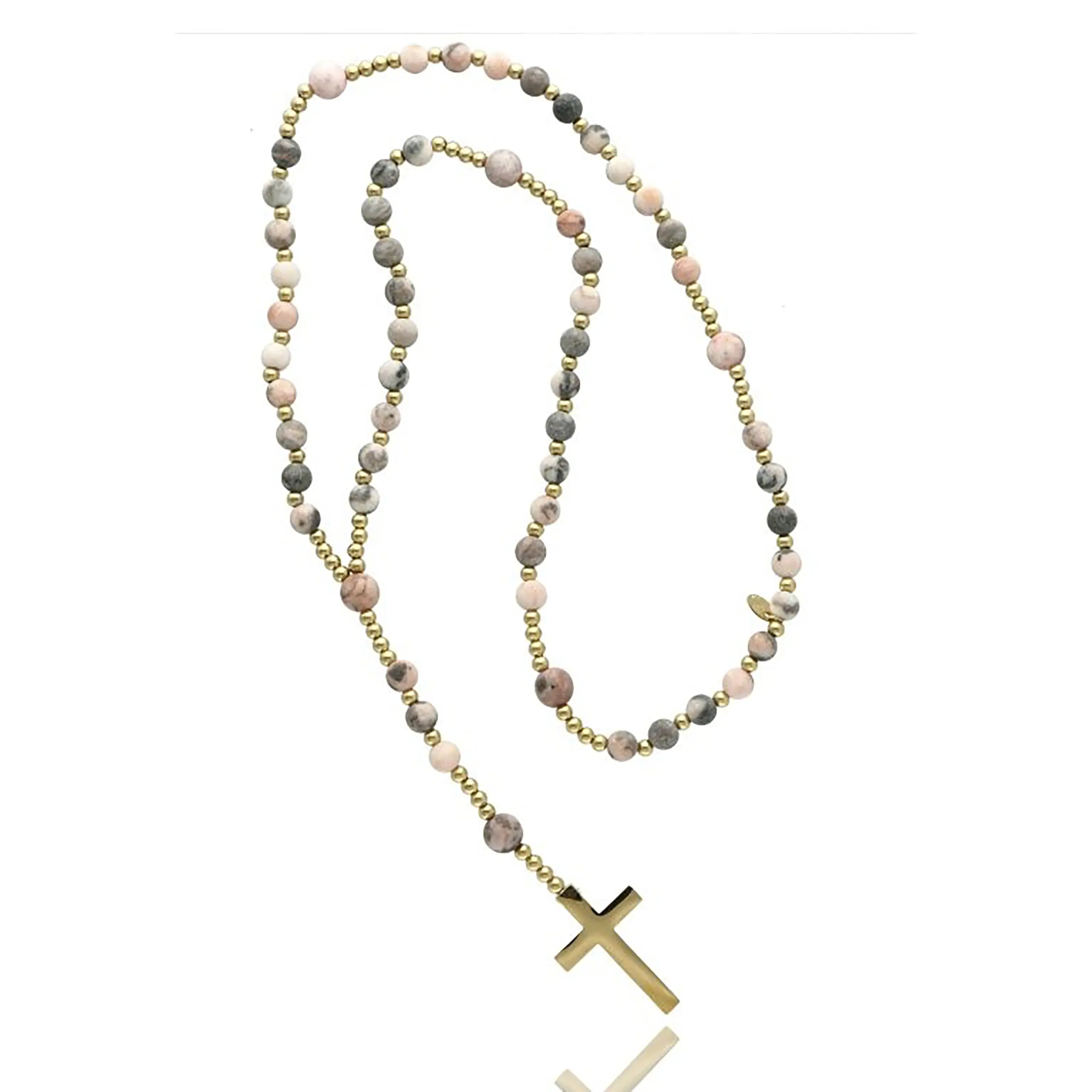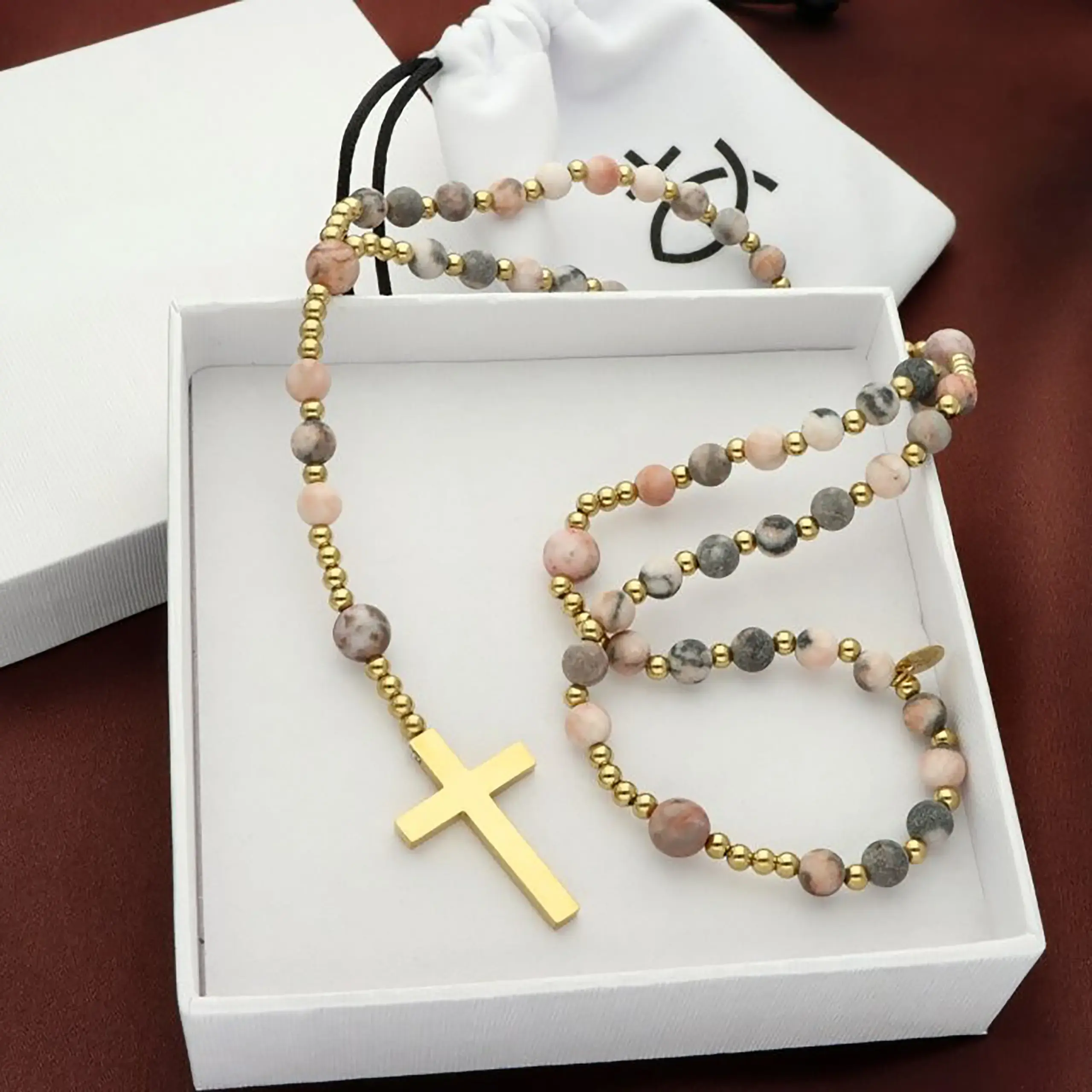 - Złoty krzyżyk ze stali szlachetnej – minimalistyczny, elegancki akcent podkreślający religijny charakter różańca.