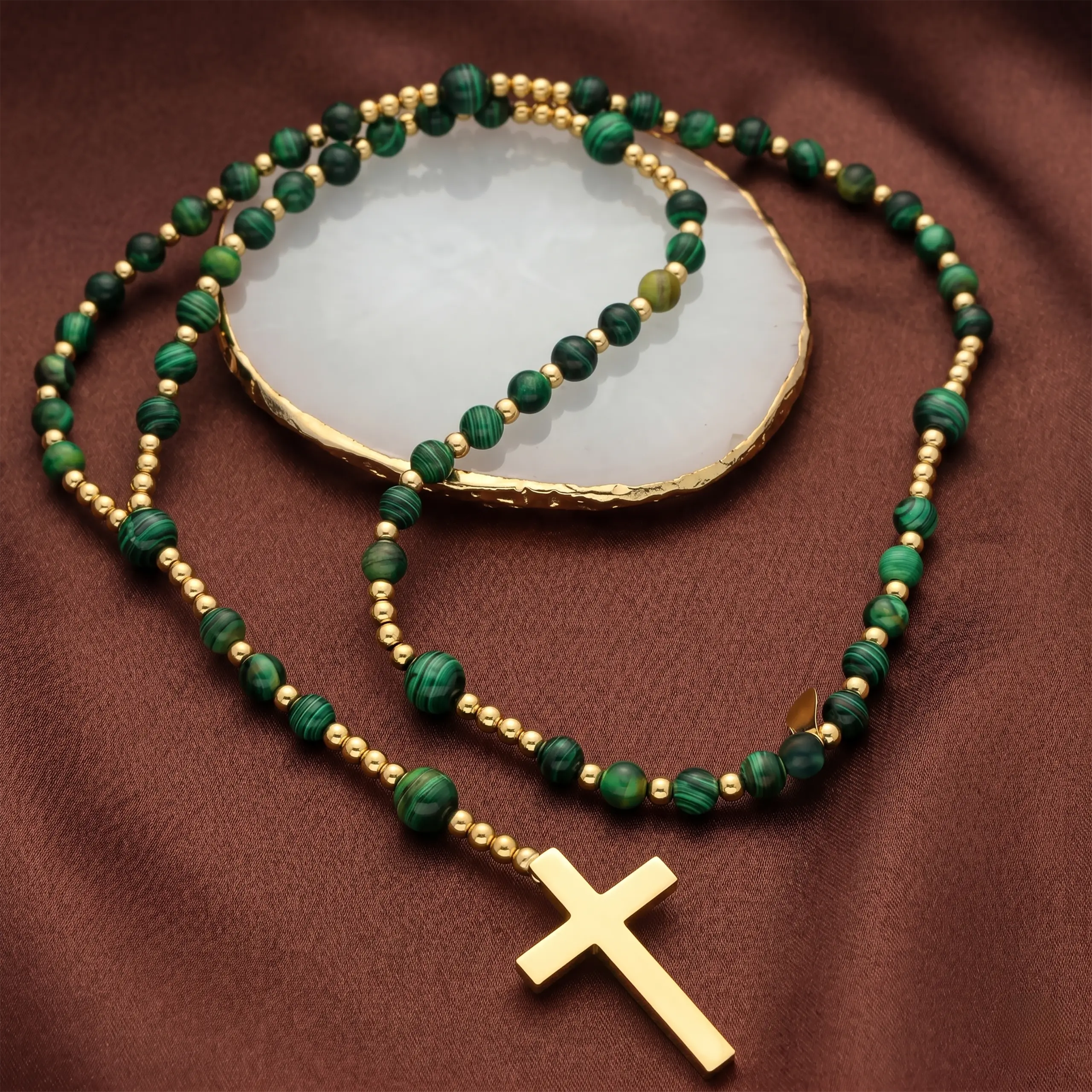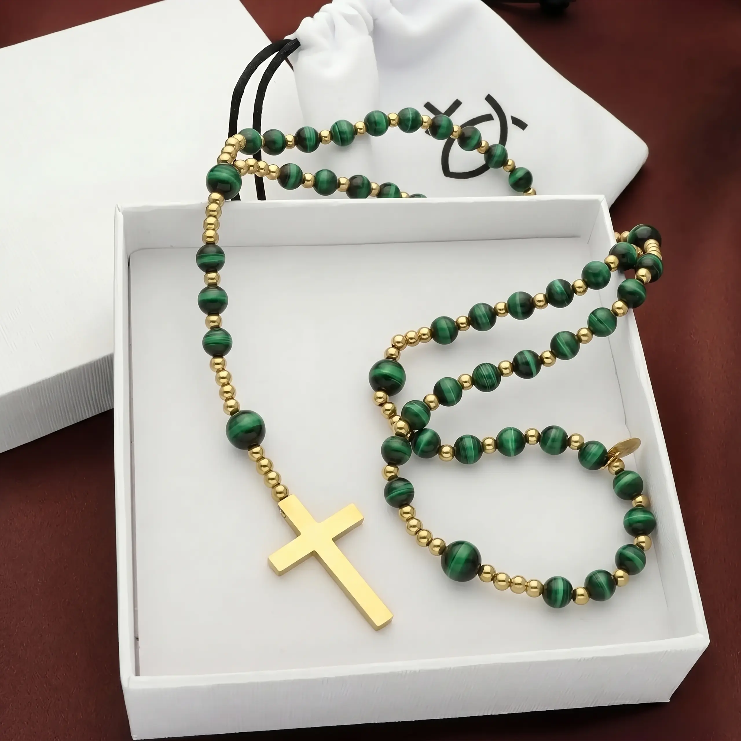 Różaniec z kamieni naturalnych wykonany z zielonego tygrysiego oka to eleganckie dewocjonalium dla osób, które chcą mieć przy sobie znak wiary każdego dnia. Połączenie głębokiej zieleni, subtelnych brązowych refleksów i złotych elementów ze stali szlachetnej sprawia, że różaniec prezentuje się bardzo estetycznie, a jednocześnie zachowuje klasyczny religijny charakter.