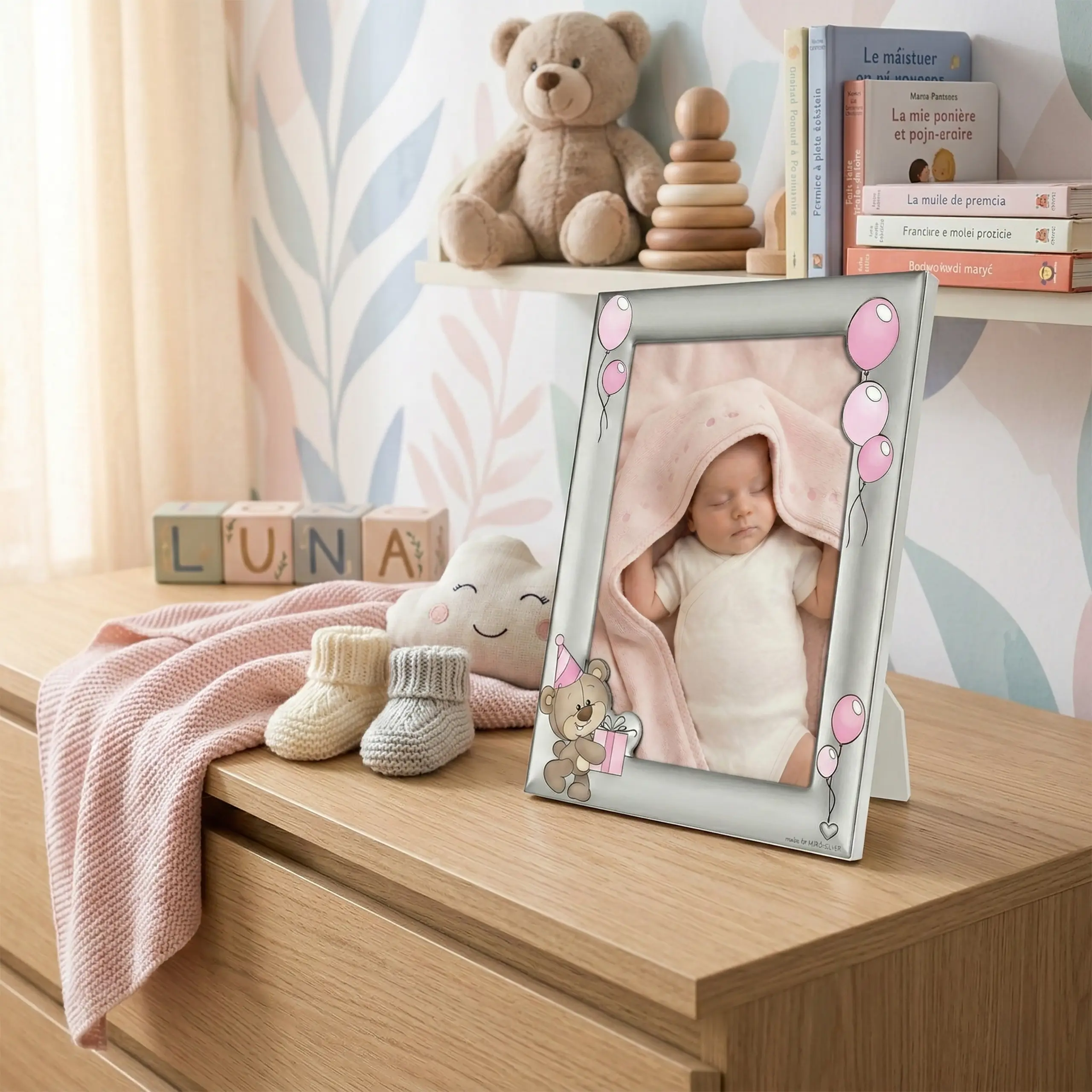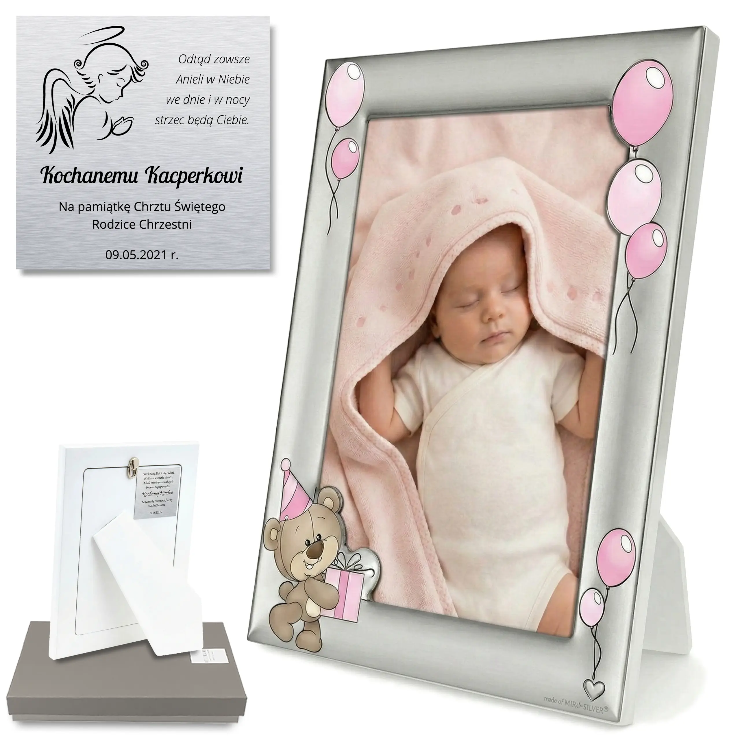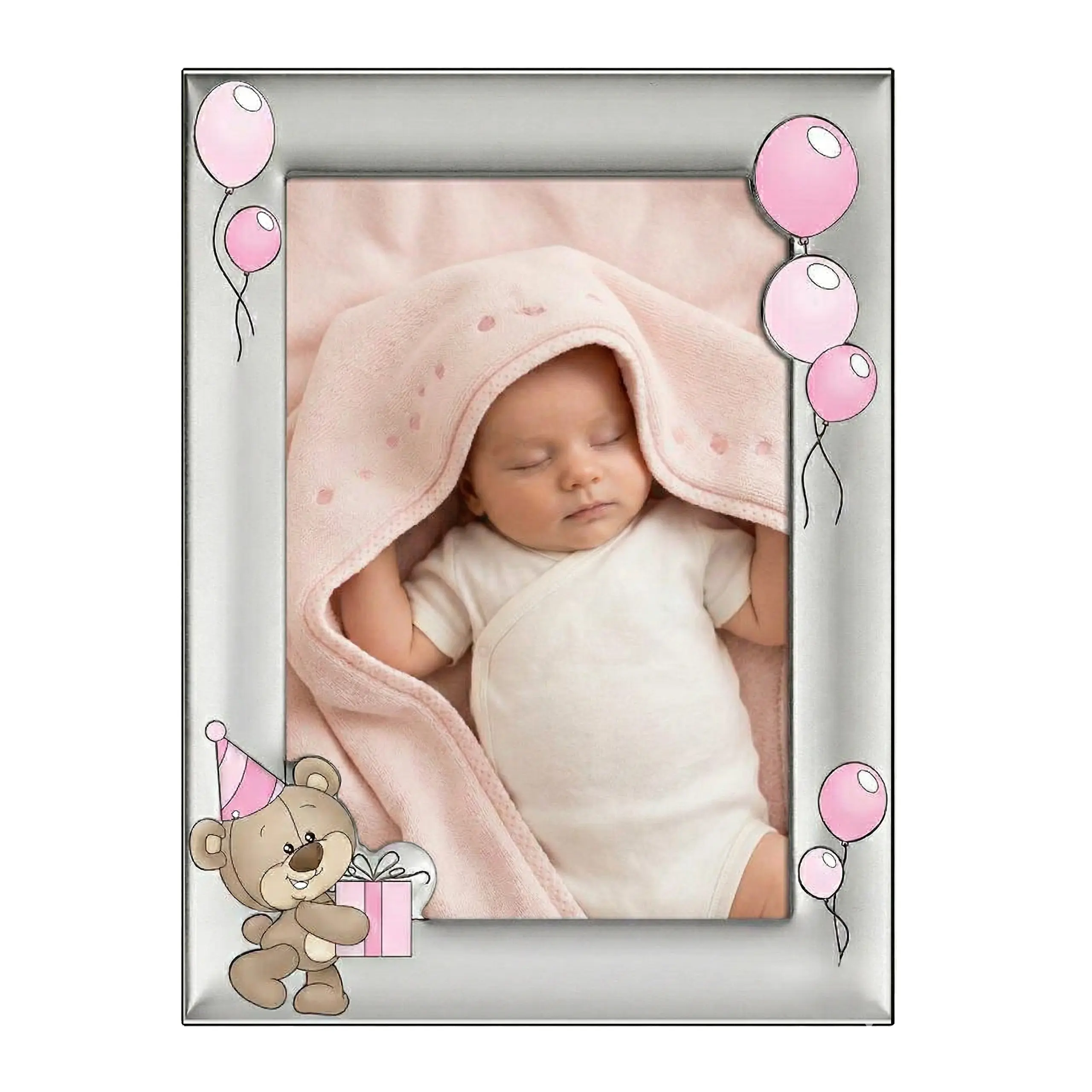 Ta wyjątkowa srebrna ramka na zdjęcie dziecka została zaprojektowana jako elegancka pamiątka ważnych chwil z życia dziecka. Delikatny wzór przedstawia uroczego misia trzymającego prezent oraz pastelowe różowe baloniki, które nadają ramce radosny i dziecięcy charakter. Dzięki temu idealnie sprawdzi się jako prezent na chrzest dla dziewczynki lub pamiątka narodzin.
