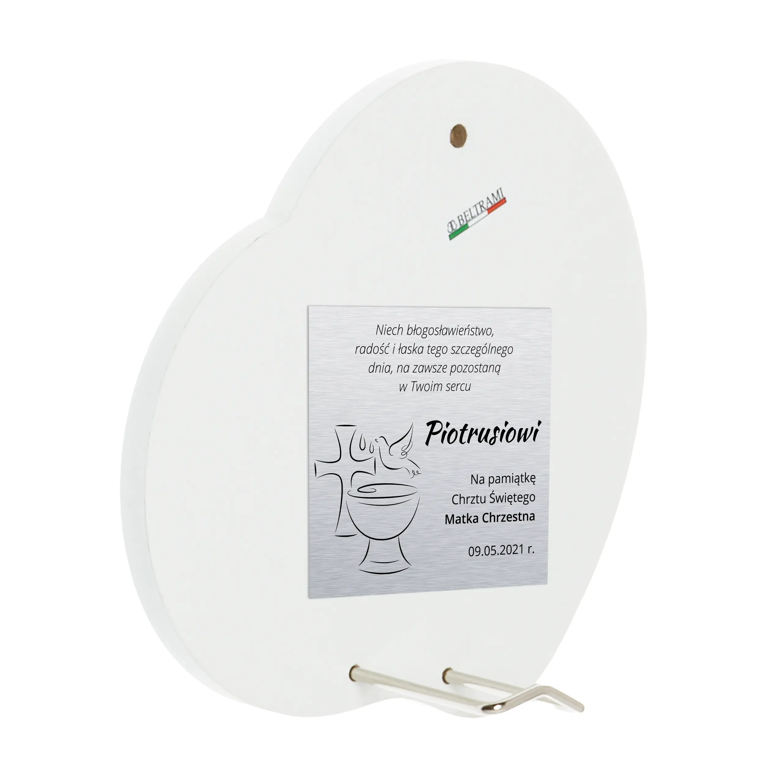 Minimalistyczna biała podstawa sprawia, że obrazek religijny dla dziecka pasuje do każdego wnętrza – zarówno klasycznego, jak i nowoczesnego pokoju dziecięcego. Dzięki solidnej konstrukcji oraz wysokiej jakości materiałom jest to trwała pamiątka chrztu świętego, która może towarzyszyć dziecku przez całe życie.