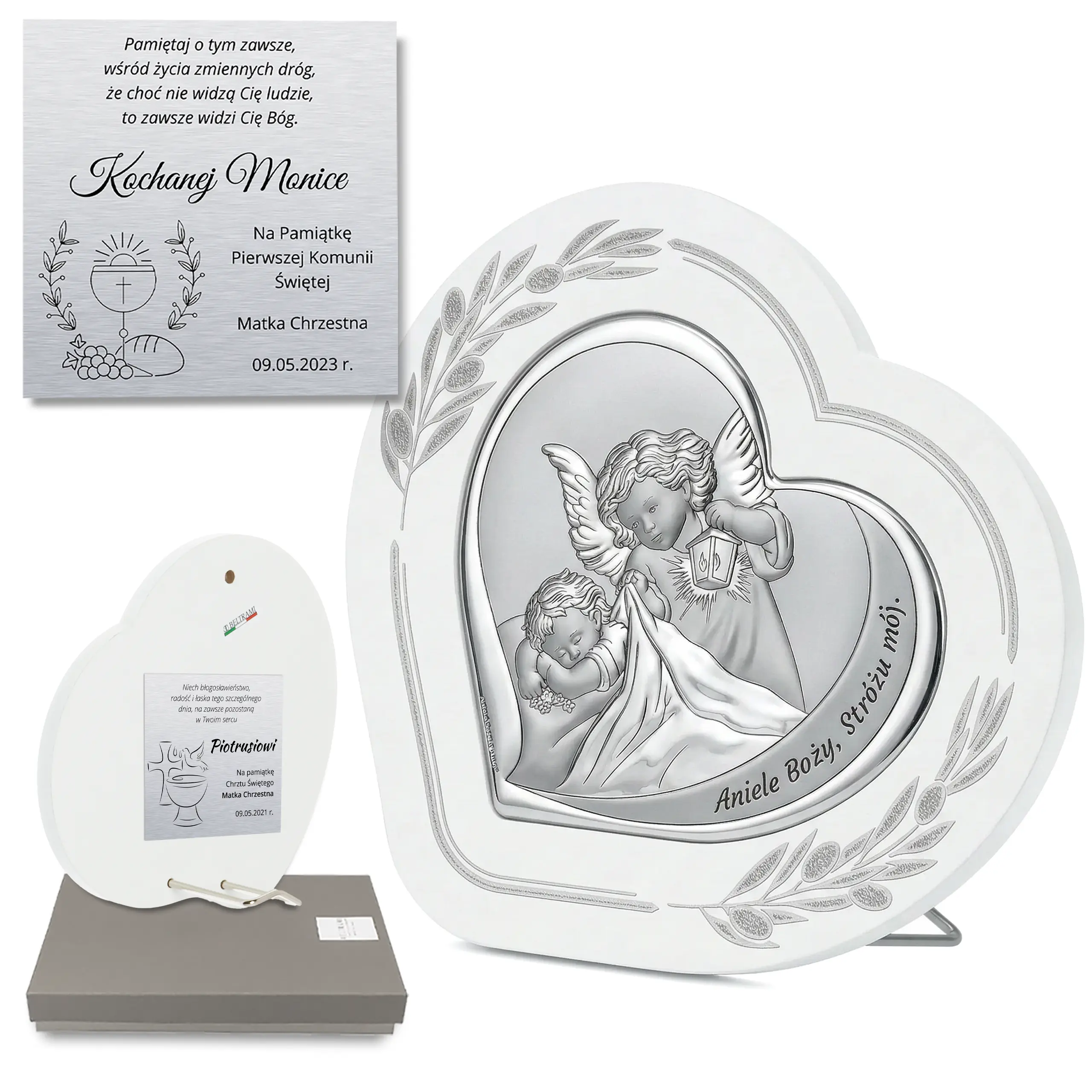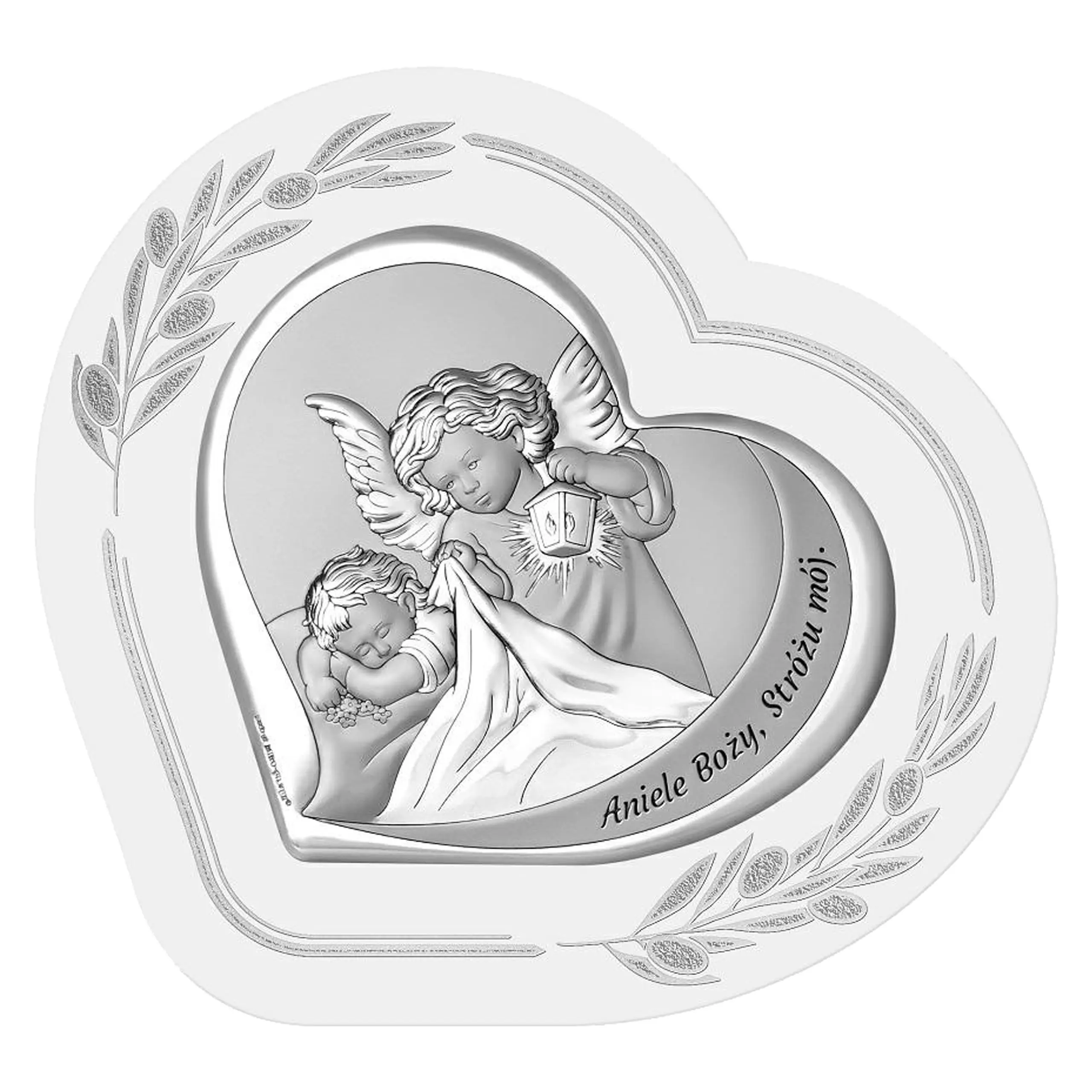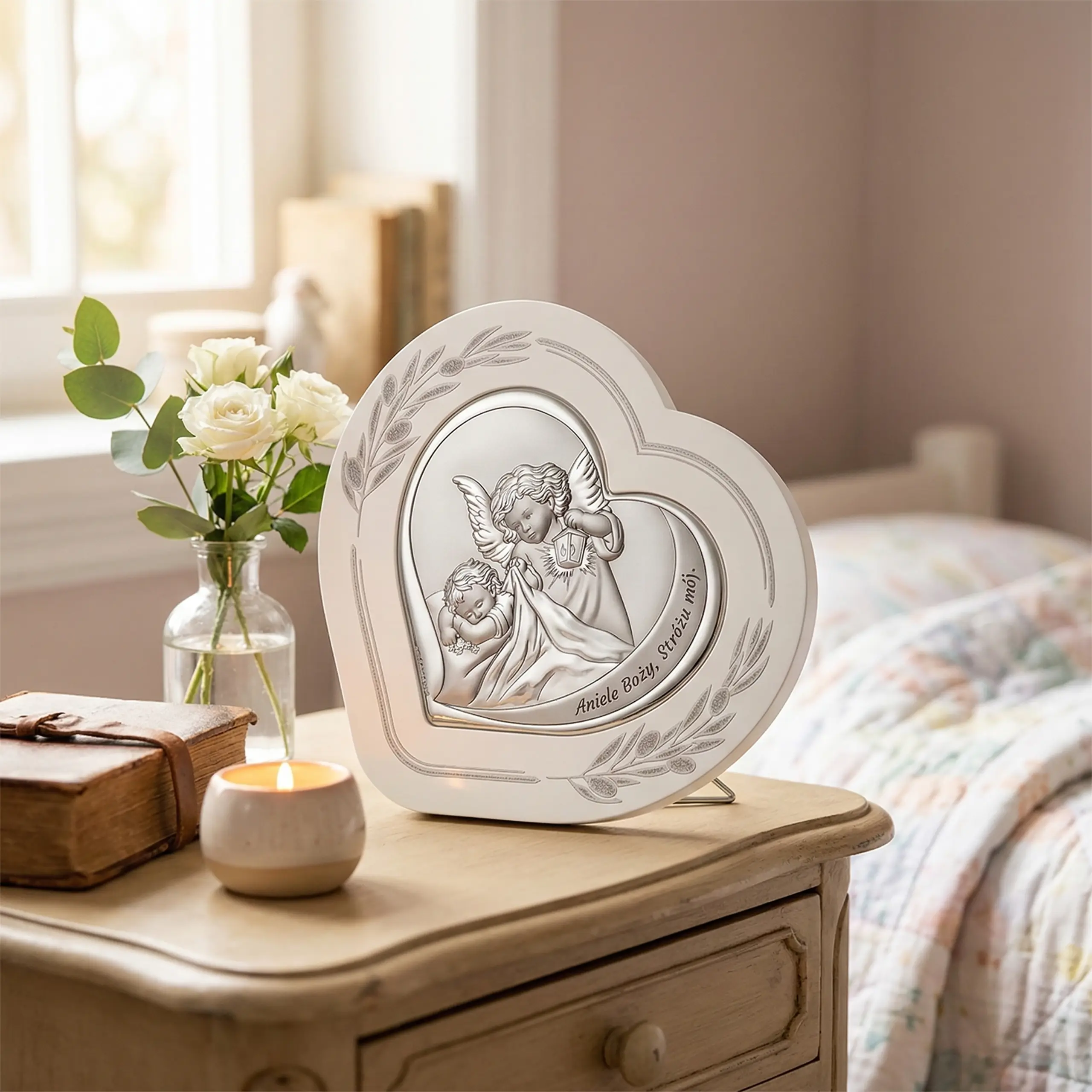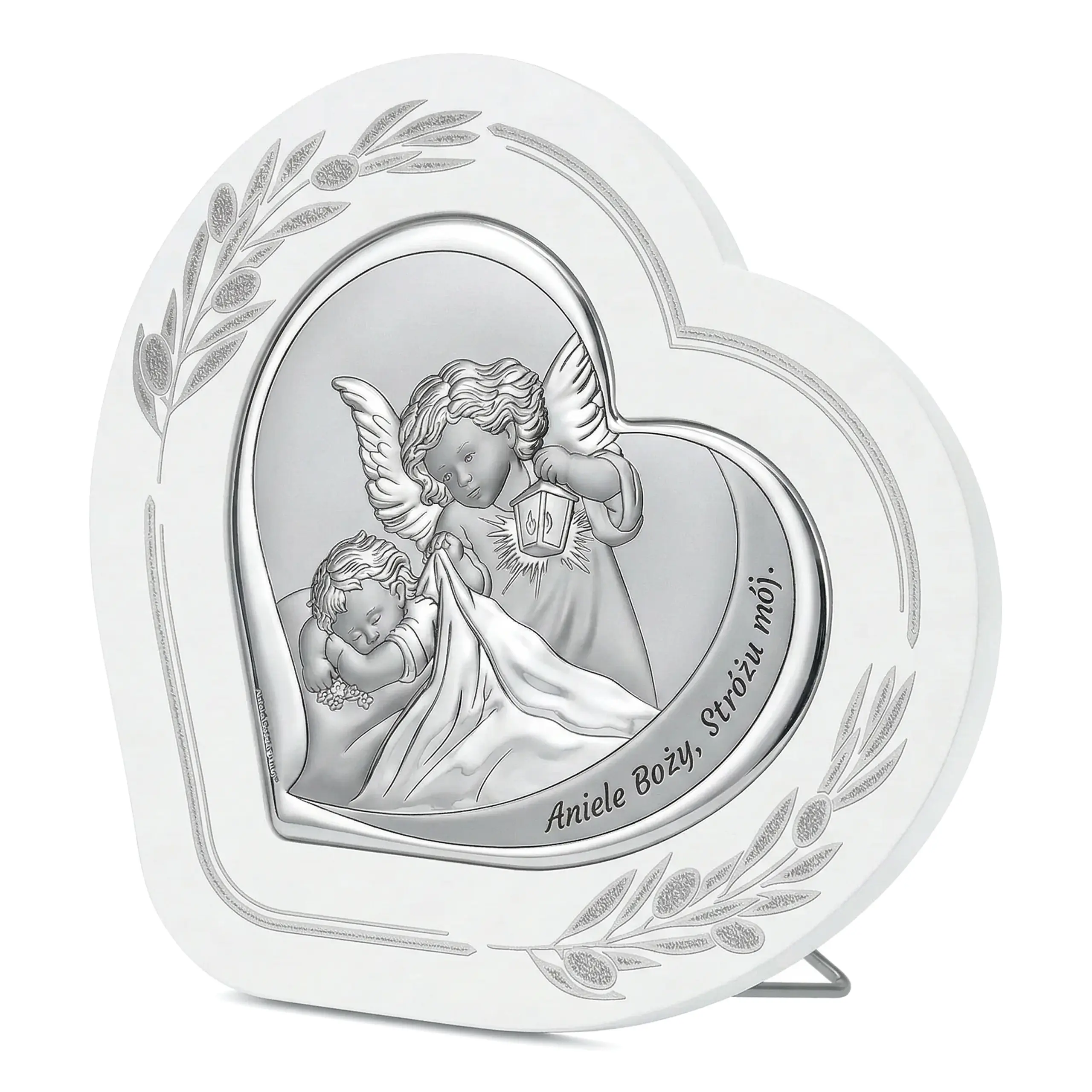 Ten wyjątkowy obrazek na chrzest został zaprojektowany w eleganckiej formie serca umieszczonego na białym panelu. Delikatne srebrne zdobienia w postaci roślinnych ornamentów subtelnie podkreślają centralną scenę z wizerunkiem Anioła Stróża. W centrum znajduje się srebrna płaskorzeźba przedstawiająca anioła z latarenką, który czuwa nad spokojnie śpiącym dzieckiem – symbol światła, bezpieczeństwa i Bożej opieki.